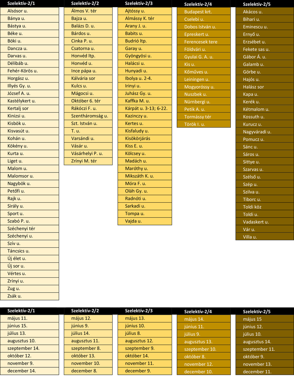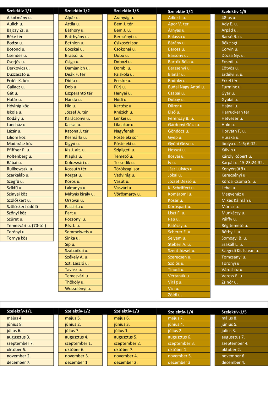A körzet beosztásokat és a körzetekhez tartozó időpontokat az alábbi táblázatok tartalmazzák.