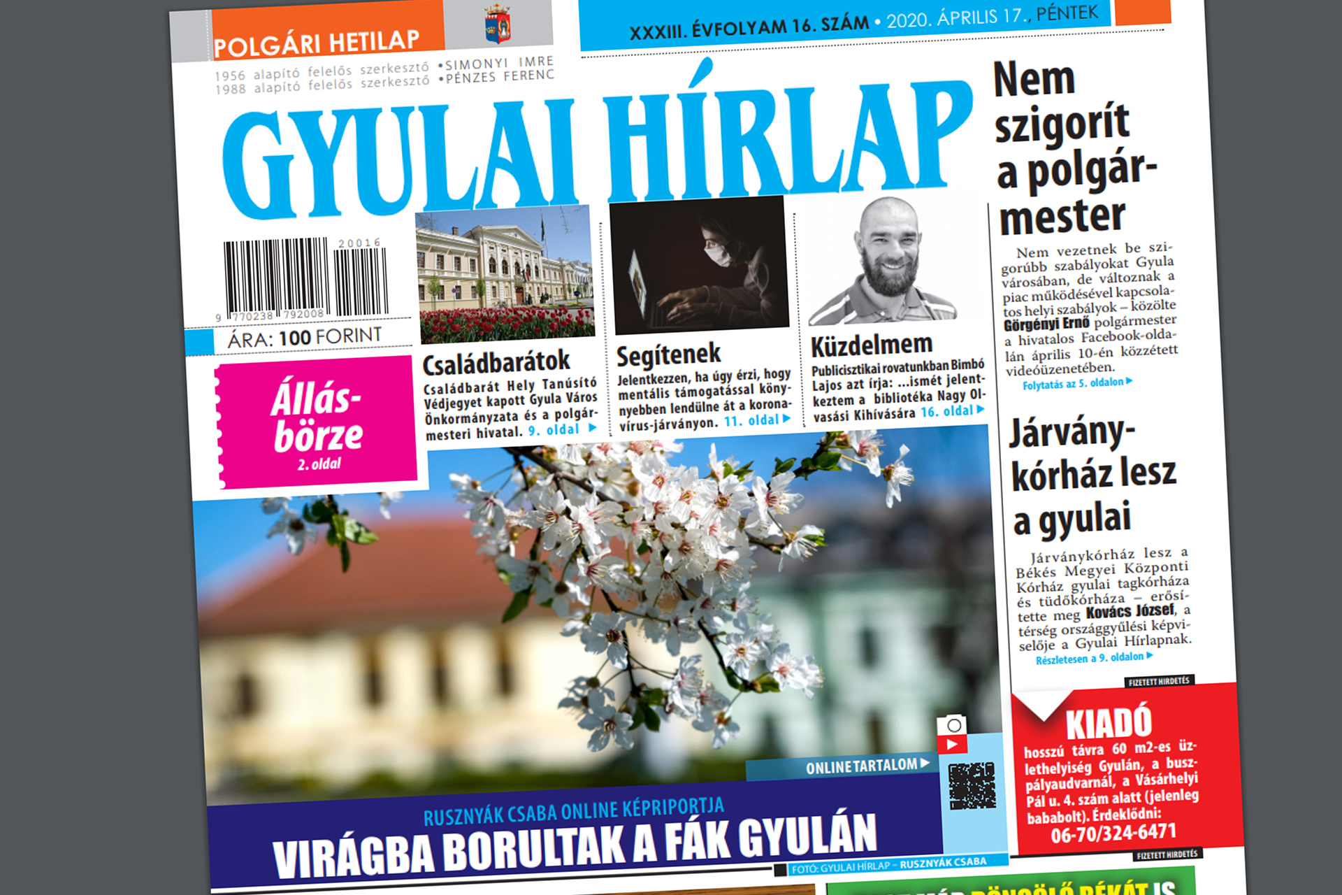 A friss Gyulai Hírlapban többek között arról írunk, hogy nem vezetnek be szigorúbb korlátozásokat Gyulán, de megváltoztak a piac működésével kapcsolatos helyi szabályok. Járványkórház lesz a Békés Megyei Központi Kórház gyulai tagkórháza és tüdőkórháza, a részletekről több anyagban is beszámolunk. Címlapfotónkat ezúttal a virágba borult fürdőváros egyik terén készítette fotósunk, Rusznyák Csaba. Lapunkban arról is hírt adunk, hogy a Családbarát Hely Tanúsító Védjegy bronz fokozatával ismerték el Gyula Város Önkormányzatát szolgáltatóhely kategóriában, a polgármesteri hivatal pedig szintén bronz fokozatos minősítést kapott munkahely kategóriában. Az újságból ezúttal sem maradnak ki az országos intézkedések, többek között arról írunk, hogy határozatlan időre meghosszabbítja a kormány a koronavírus-járvány miatt két hete elrendelt kijárási korlátozást. A járvány idején a fogyatékkal élők számára is segítséget nyújt a gyulai önkormányzat a bevásárlásban, a gyógyszerek kiváltásában és az ügyintézésben. Ha valakinek segítségre van szüksége, vagy tud olyanról, akinek segítségre volna szüksége, telefonon és e-mailben is jelezheti. Az újságban emellett cikket közlünk a városi sporttelep új kültéri fitneszparkjáról és játszóeszközeiről, a gyulai labdarúgócsapat és futsalegyüttesek tagjainak egyéni edzéseiről, A legszebb konyhakertek nevű országos verseny kiírásáról, a gyulai baptista gyülekezet körében szervezett véradásról, valamint arról, hogy szárítógépre gyűjtenek a helyi mentősöknek. Lapunkból természetesen ezúttal sem hiányozhatnak az állandó rovatok és a jegyzet.