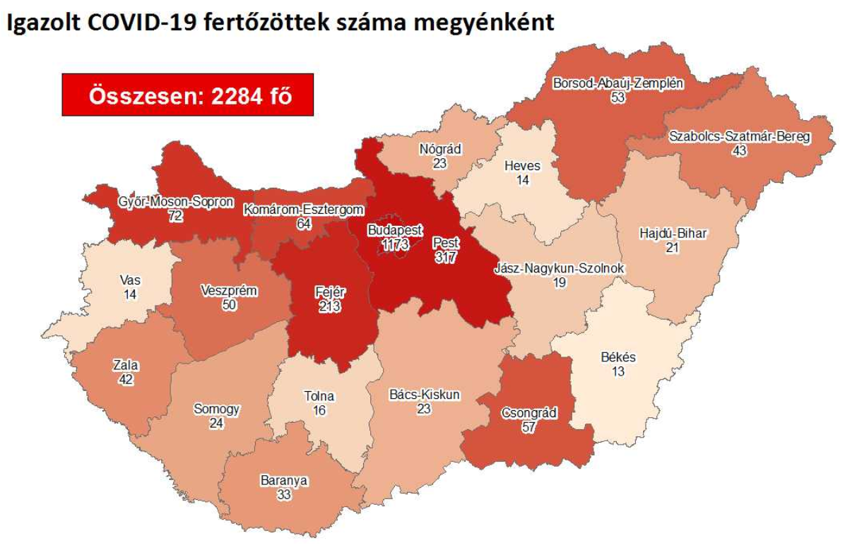 Az oldal térképe alapján továbbra is Budapesten (1173 ember) és Pest megyében (317) van a legtöbb fertőzött. Ezt követi Fejér megye (213), Győr-Moson-Sopron megye (72), Csongrád megye (57), és Borsod-Abaúj-Zemplén megye (53). Békés megyében van a legkevesebb fertőzött (13) Magyarországon.