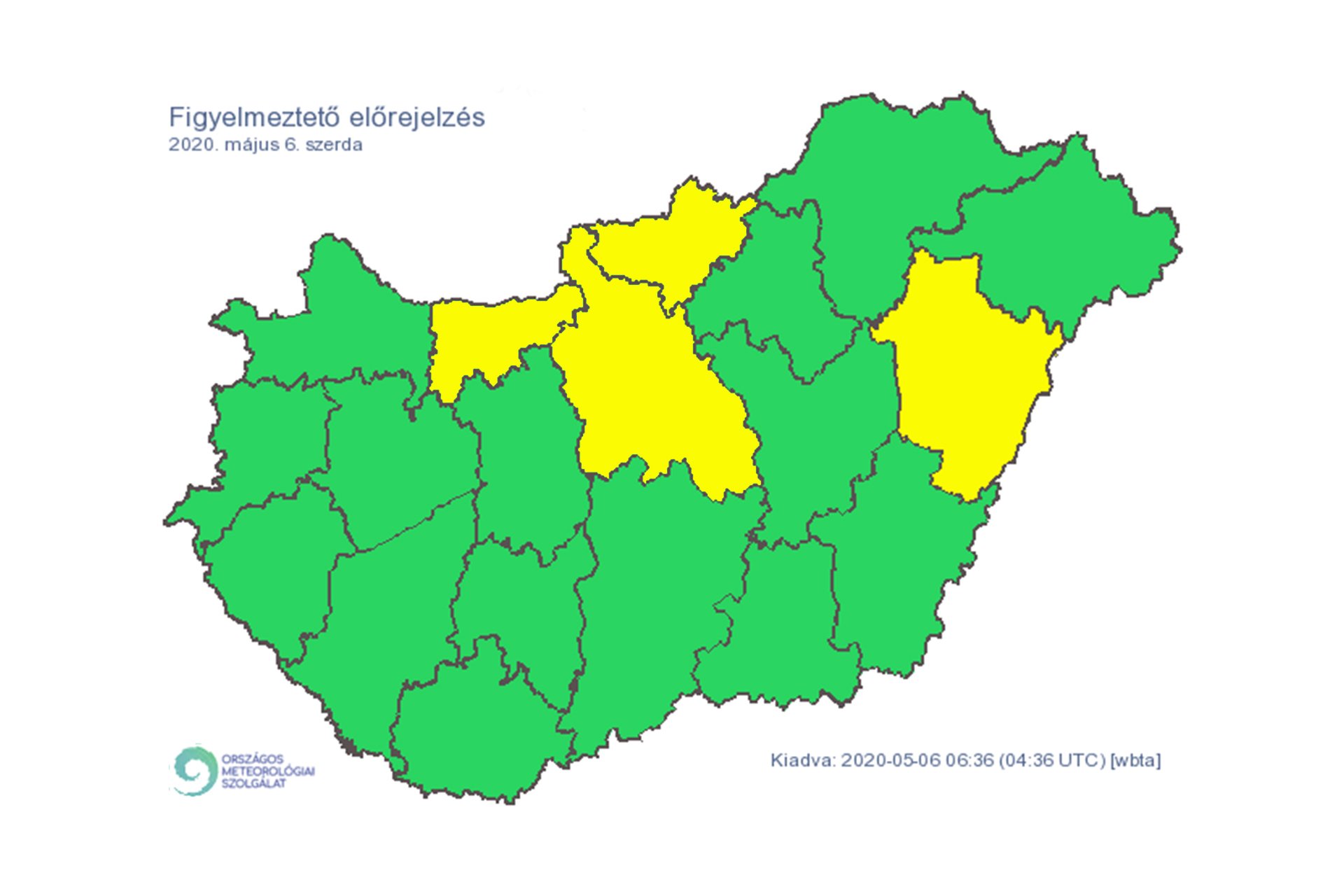 Elsőfokú veszélyjelzést adott ki az Országos Meteorológiai Szolgálat Pest, Hajdú-Bihar, Komárom-Esztergom és Nógrád megyére. Hajnalban a keleti megyékben beágyazott zivatar előfordulhat. Napközben az erős északnyugati szelet az Észak-Dunántúlon és Közép-Magyarországon viharos, a középső-északi tájakon akár 70 km/h-t is elérő lökések kísérhetik – figyelmeztet az Országos Meteorológiai Szolgálat.
