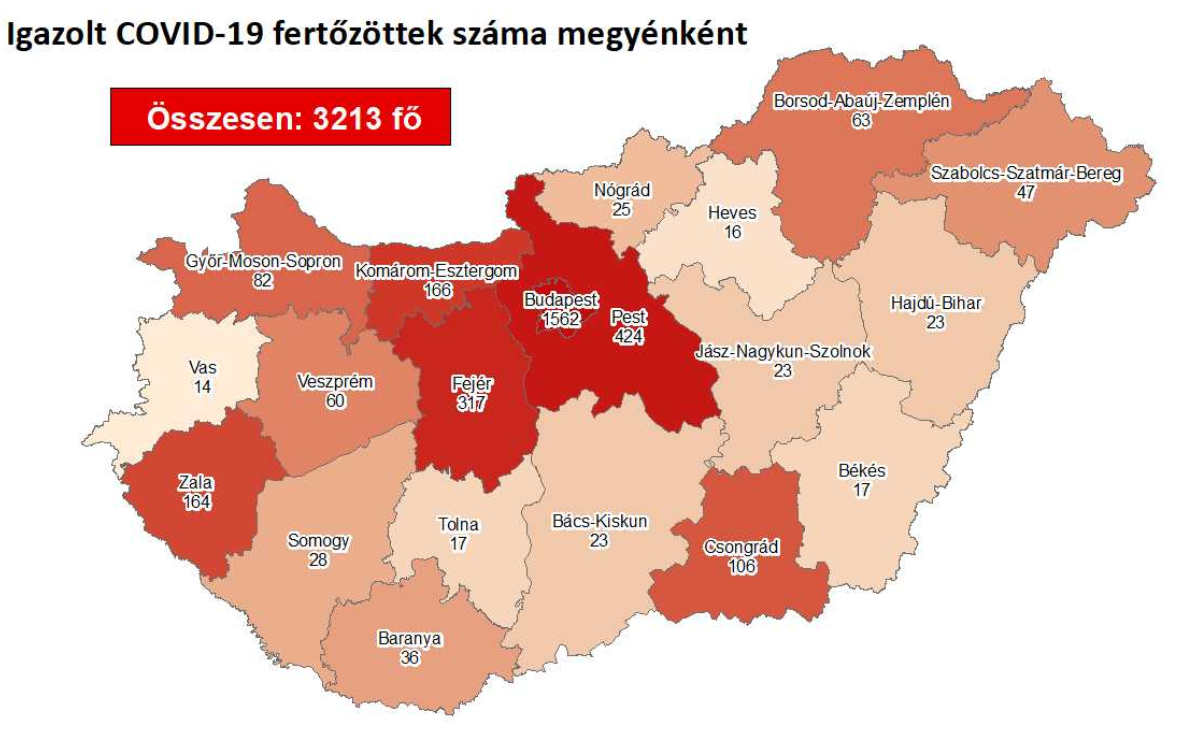 Az oldal térképe alapján továbbra is Budapesten (1562 ember) és Pest megyében (424) van a legtöbb fertőzött. Ezt követi Fejér megye (317), Komárom-Esztergom megye (166), Zala megye (164) és Csongrád megye (106). Vas megyében (14) van a legkevesebb fertőzött Magyarországon.