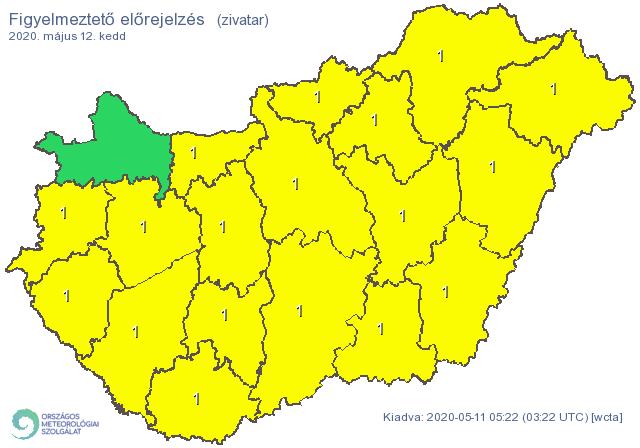 Ma késő délutántól az Északi-középhegység térségében, estétől pedig a hidegfront mentén északnyugaton a záporok mellett néhol zivatar (egy-egy heves zivatar) is előfordulhat. A hidegfront átvonulásával északnyugat felől egyre többfelé várható csapadék, a záporok és eső mellett néhol zivatar, heves zivatar is lehet. A zivatarokat viharos szél (75-90 km/h, heves zivatart akár >90 km/h) és jégeső kísérheti.