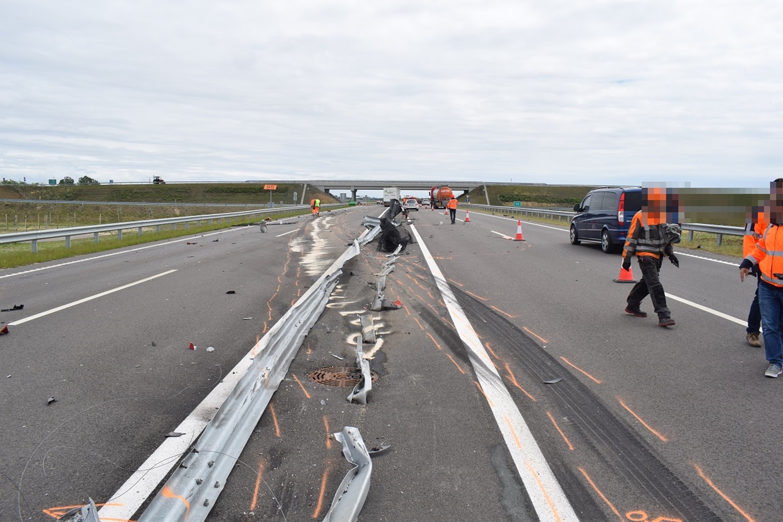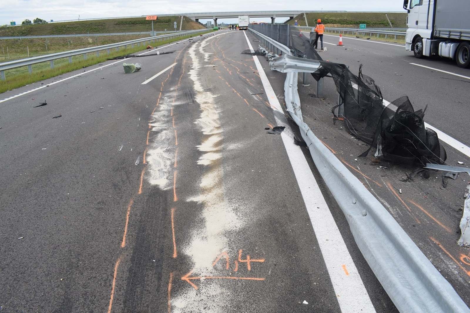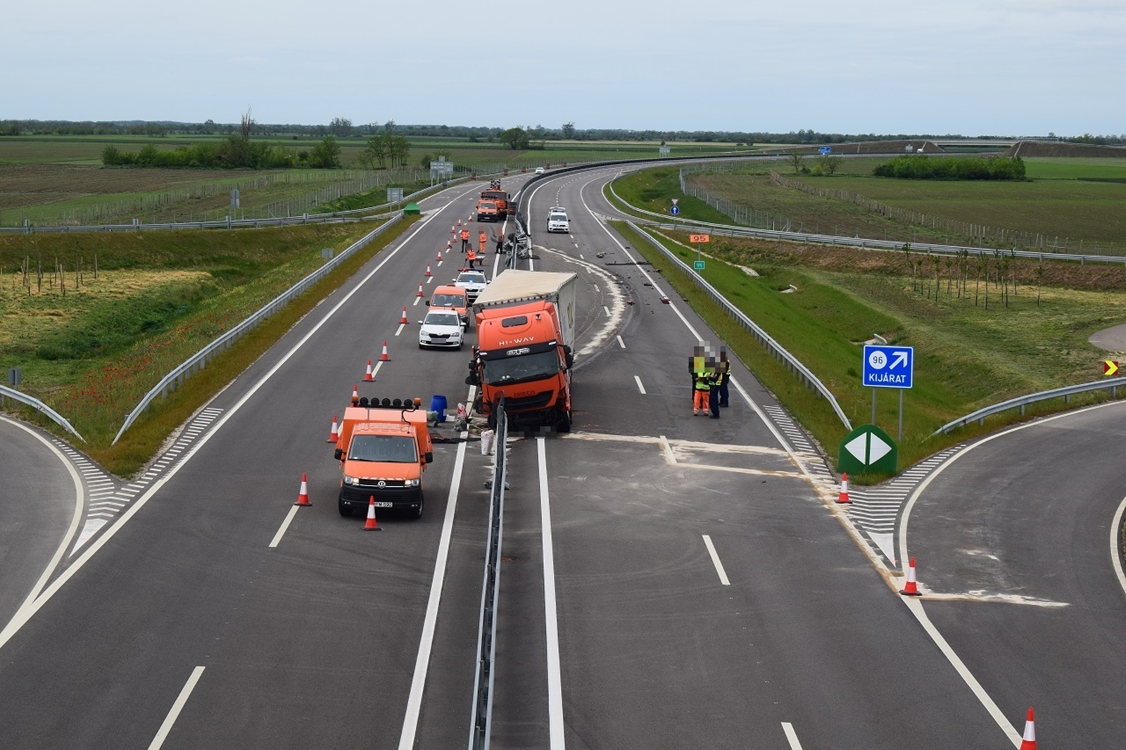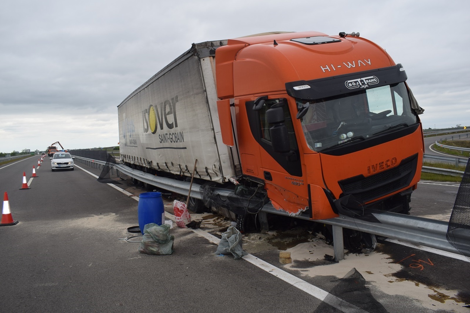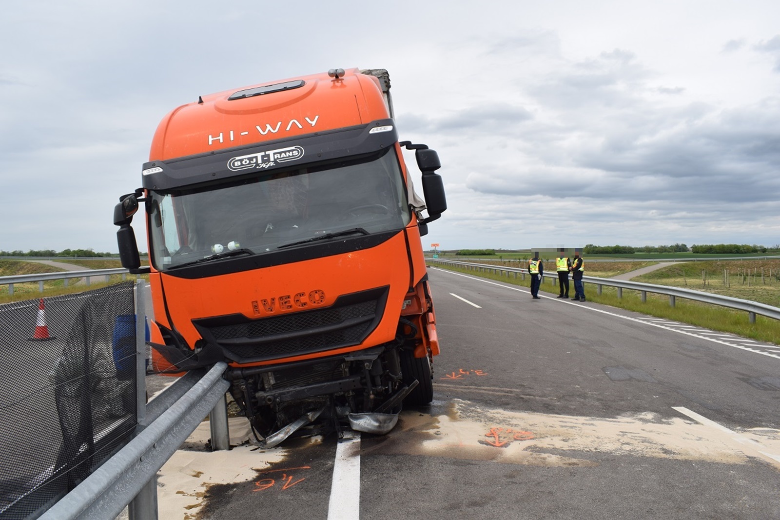 A tehergépkocsi Békéscsaba irányába közlekedett. Miután átszakította a szalagkorlátot, áttért a menetiránya szerinti bal oldalra. A mentők a járművet vezető férfit könnyű sérüléssel vitték kórházba.