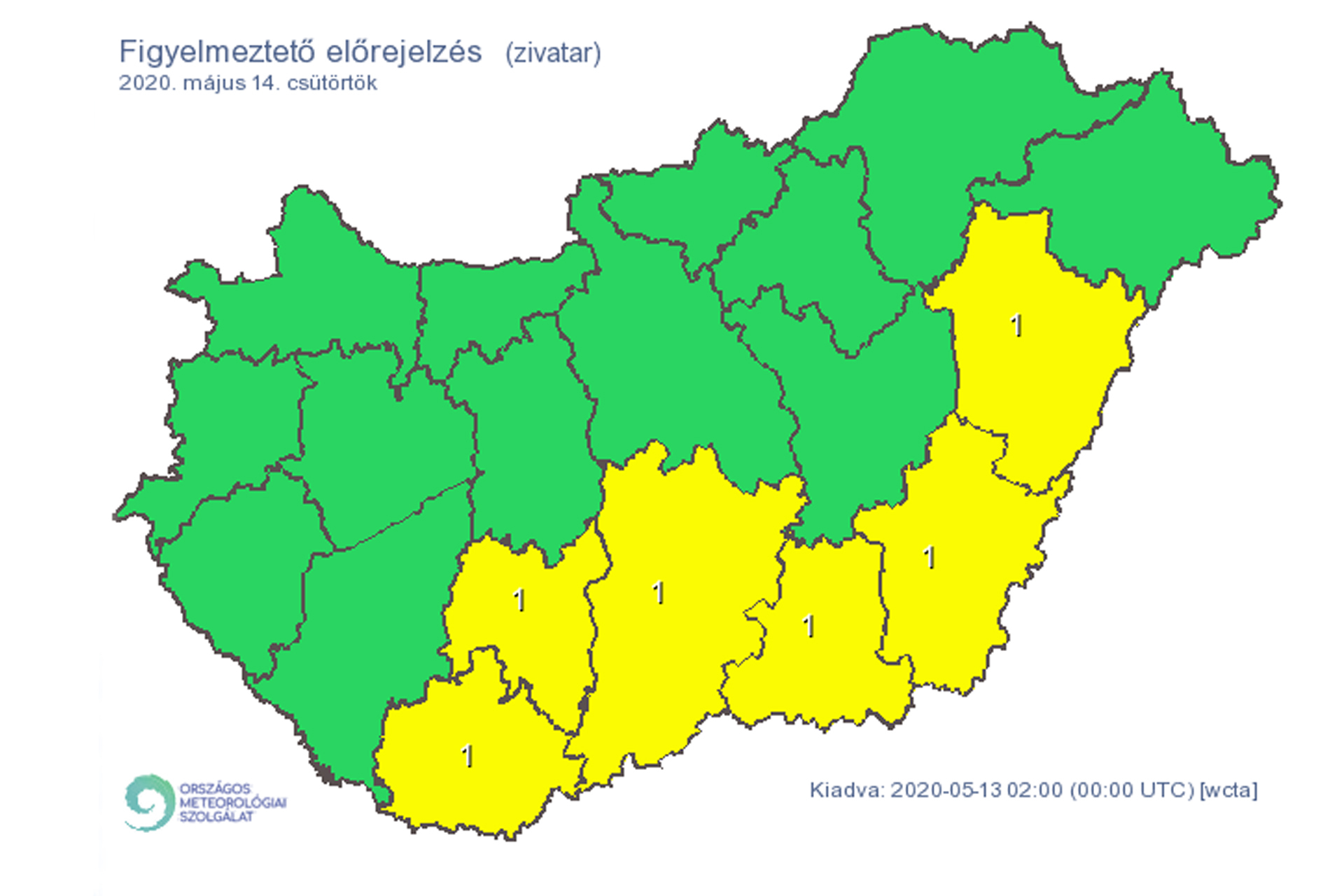 Az OMSZ előrejelzése szerint szerdán a késő délutáni, esti óráktól elsősorban a Dunántúl északi területein és kisebb eséllyel a déli országrészben alakulhatnak ki gyengébb zivatarok.