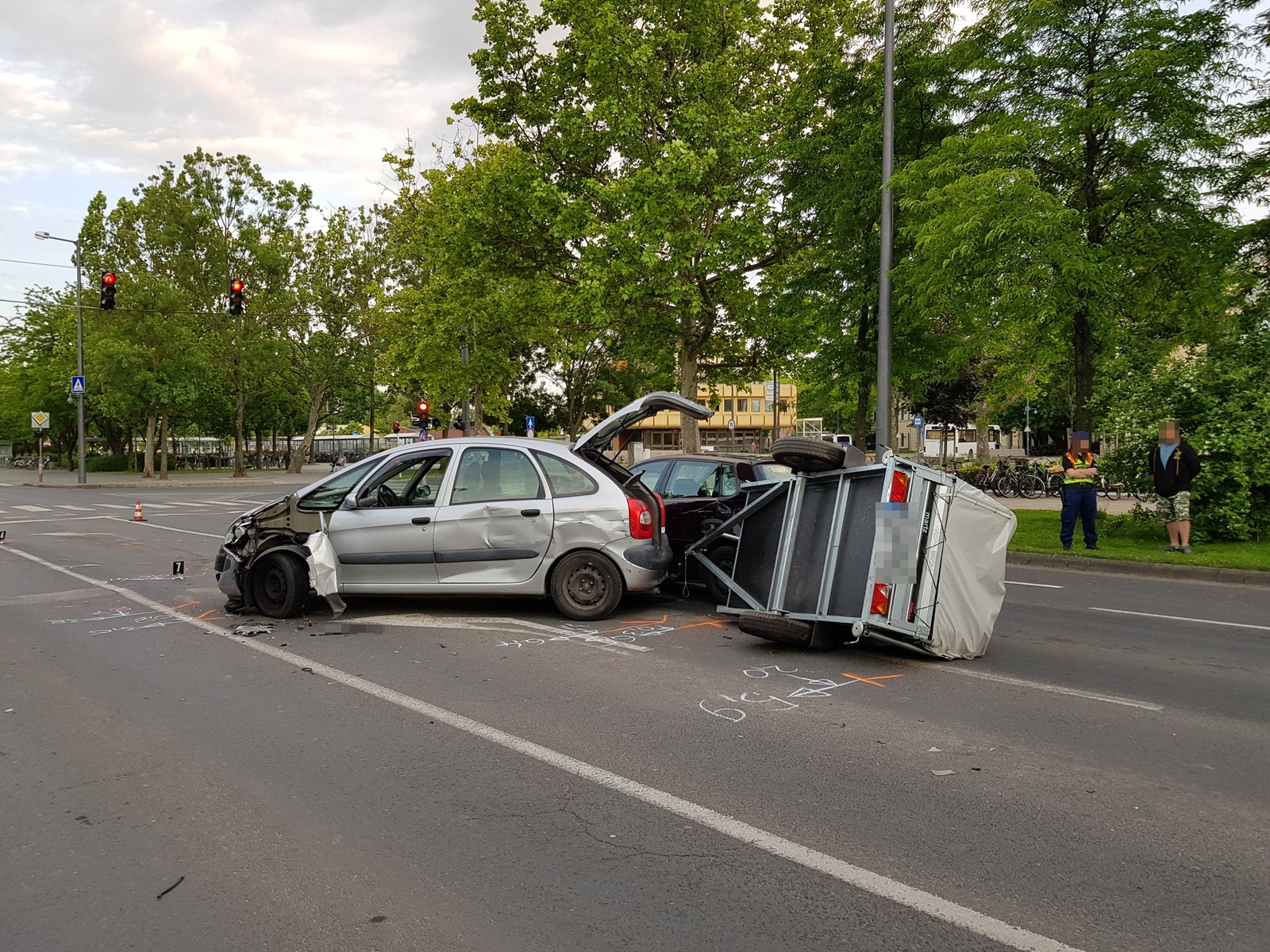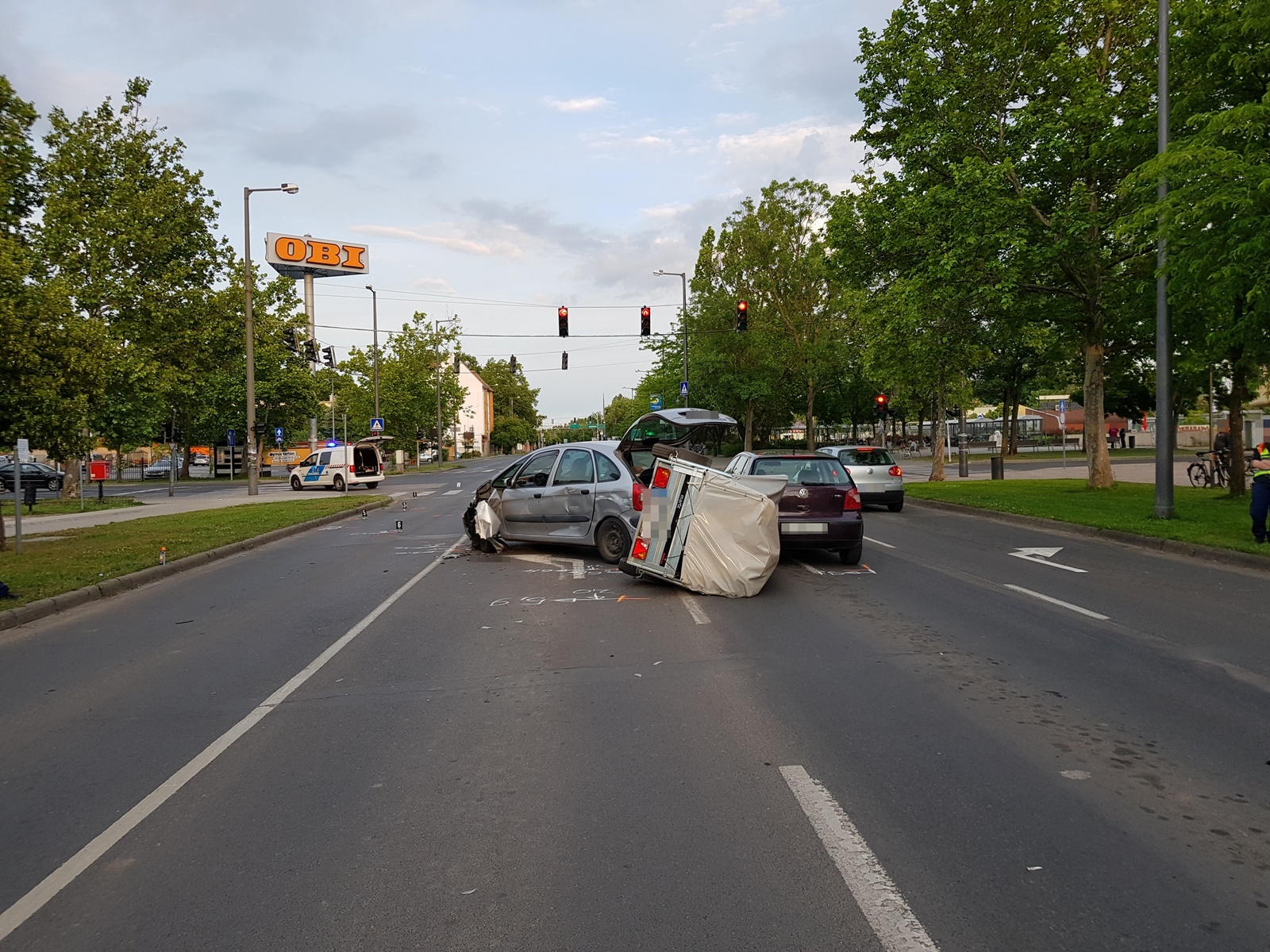 Szintén Békéscsabán, a Temető sor, az Andrássy út és a Szabolcs utca találkozásánál másfél órával később egy utánfutót húzó személyautó a jobbra kanyarodó forgalmi sávból egyenesen haladt tovább, majd összeütközött egy tehergépkocsival. Az utánfutó felborult, és egy, a piros lámpánál álló személygépkocsinak csapódott. A szabad jelzésre várakozó járművet vezető nő nyolc napon belül gyógyuló sérülést szenvedett.