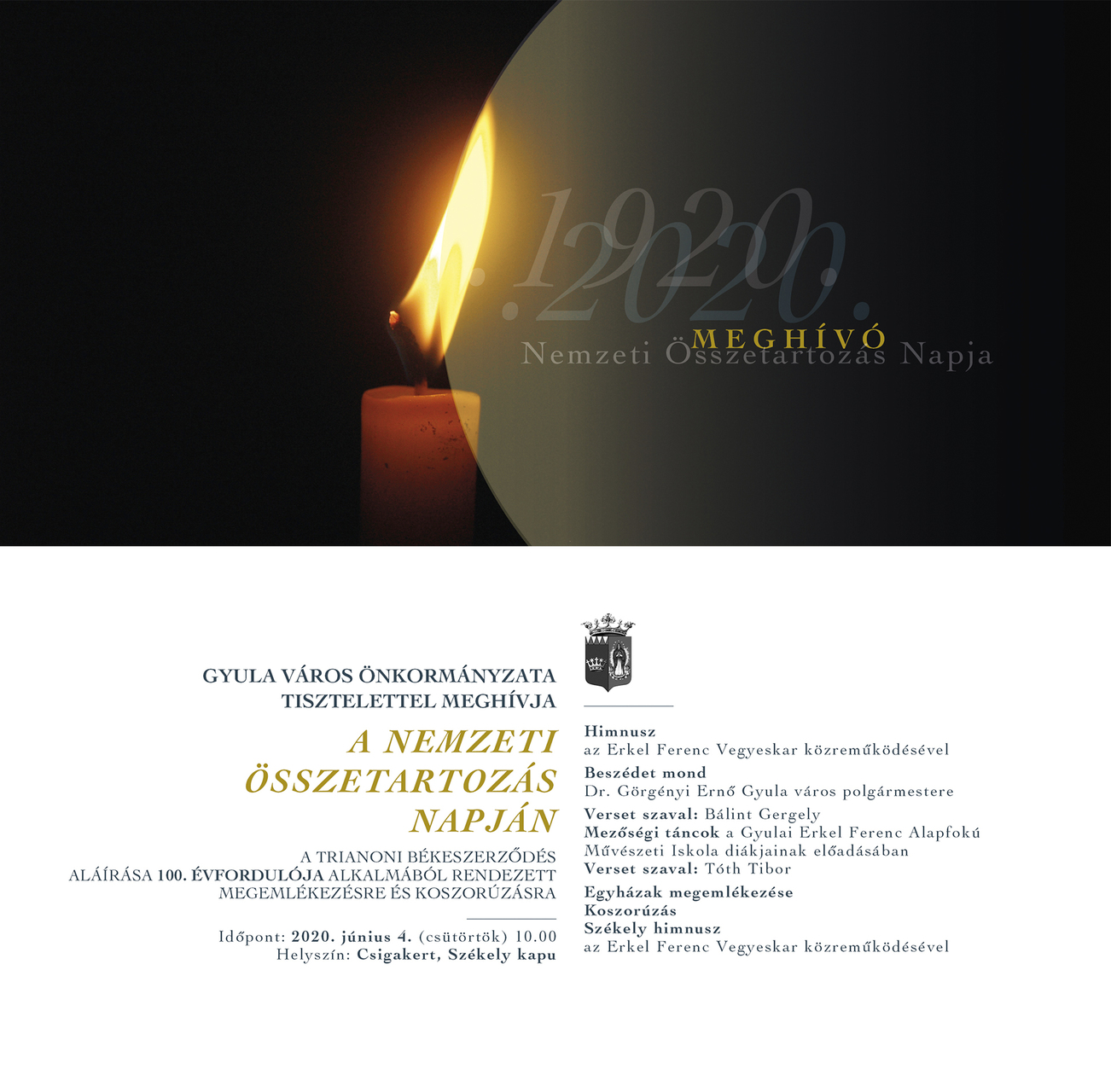 Gyula Város Önkormányzata tisztelettel meghívja a Nemzeti Összetartozás Napján a trianoni békeszerződés aláírása 100. évfordulója alkalmából rendezett megemlékezésre és koszorúzásra.
