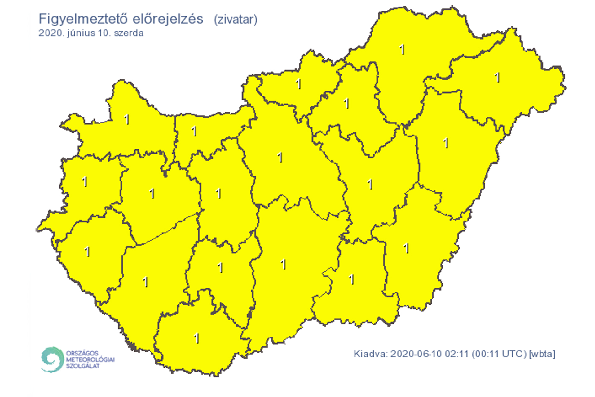 Zivatarveszély miatt az ország egész területére, felhőszakadás miatt 15 megyére adott ki elsőfokú figyelmeztetést szerdán az Országos Meteorológiai Szolgálat.