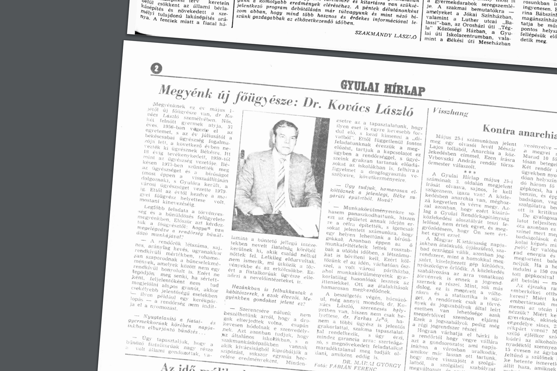 Megyénknek ez év május 1-jétől új főügyésze van, dr. Kovács László személyében. Nős, két felnőtt gyermek atyja, 57 éves. 1956-ban végezte el az egyetemet, s az év júliusától a békéscsabai ügyészség fogalmazója lett, a következő évben nevezték ki ügyésznek Békésre. Itt 18 évig tevékenykedett, 1959-től mint az ügyészség vezetője. Békésen 1975-ben szüntették meg az ügyészséget és a bíróságot (most éppen a visszaállításán dolgoznak), s Gyulára került, a városi ügyészséget vezette 1979-ig. Ettől az évtől kezdve a megyei főügyész helyettese volt mostani kinevezéséig. Legfőbb feladata a törvényesség és a bűnüldözés felügyelete megyénkben (...)