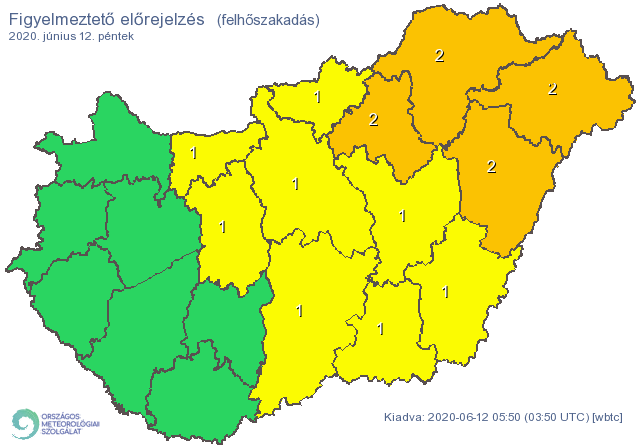 Zivatarveszély és felhőszakadás miatt péntekre az ország több területére elsőfokú és másodfokú figyelmeztetést adott ki az Országos Meteorológiai Szolgálat.