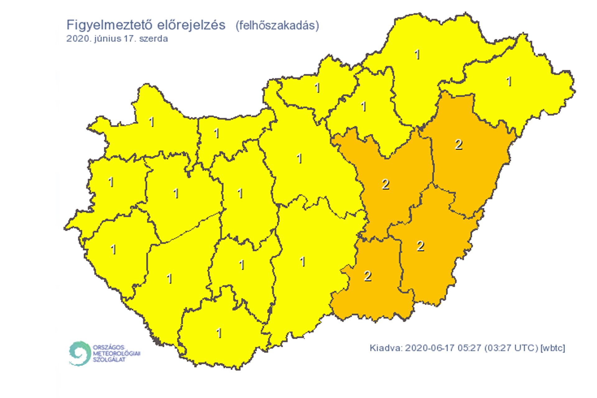 Az MTI-hez eljuttatott veszélyjelzésük szerint Békés, Csongrád-Csanád, Hajdú-Bihar és Jász-Nagykun-Szolnok megyében van másodfokú figyelmeztetés, míg az ország többi területén elsőfokú a figyelmeztetés a felhőszakadás veszélye miatt.