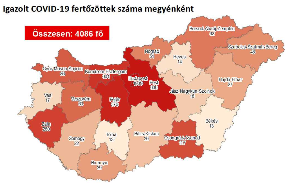 Az oldal térképe alapján eddig Budapesten (1939) és Pest megyében (600) regisztrálták a legtöbb fertőzöttet. Ezt követi Fejér (376), Komárom-Esztergom (301), Zala (260) és Csongrád-Csanád megye (117), a sor végén pedig Békés és Tolna megye áll (13).