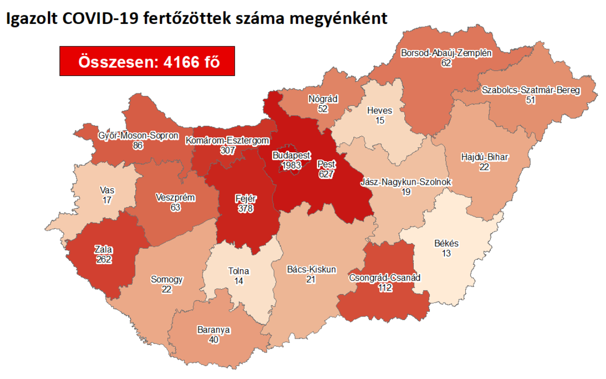Az oldal térképe alapján eddig Budapesten (1983) és Pest megyében (627) regisztrálták a legtöbb fertőzöttet. Ezt követi Fejér (378), Komárom-Esztergom (307), Zala (262) és Csongrád-Csanád megye (112), a sor végén Békés megye áll (13).