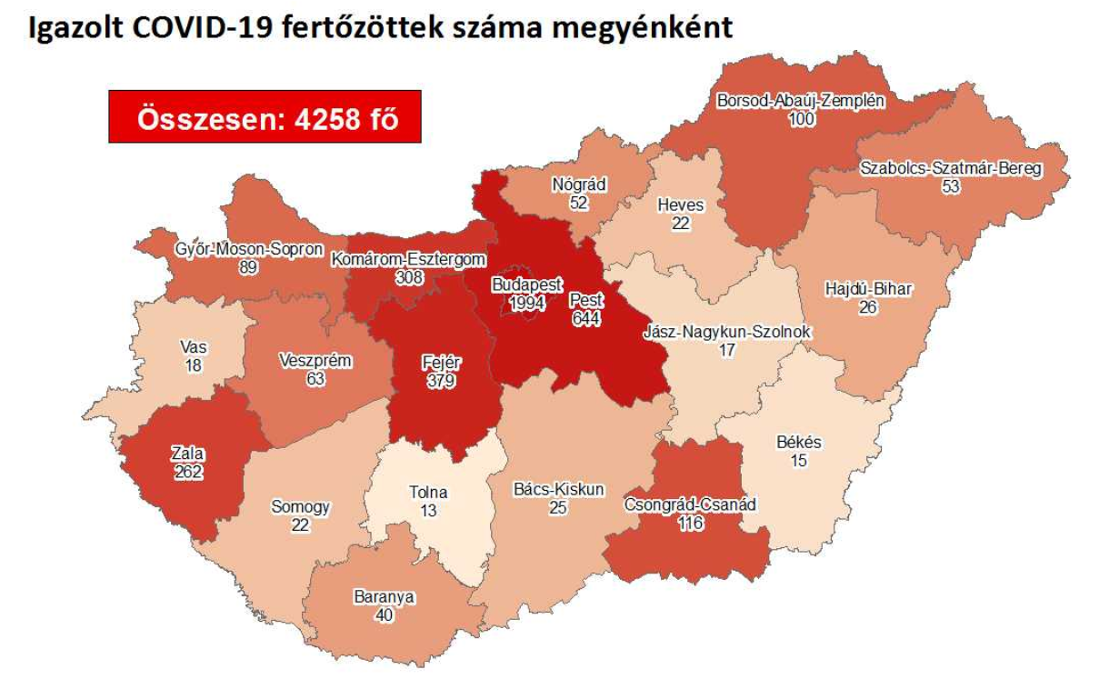 Az oldal térképe alapján eddig Budapesten (1994) és Pest megyében (644) regisztrálták a legtöbb fertőzöttet. Ezt követi Fejér (379), Komárom-Esztergom (308), Zala (262) és Csongrád-Csanád megye (116), a sor végén pedig Tolna megye áll (13).