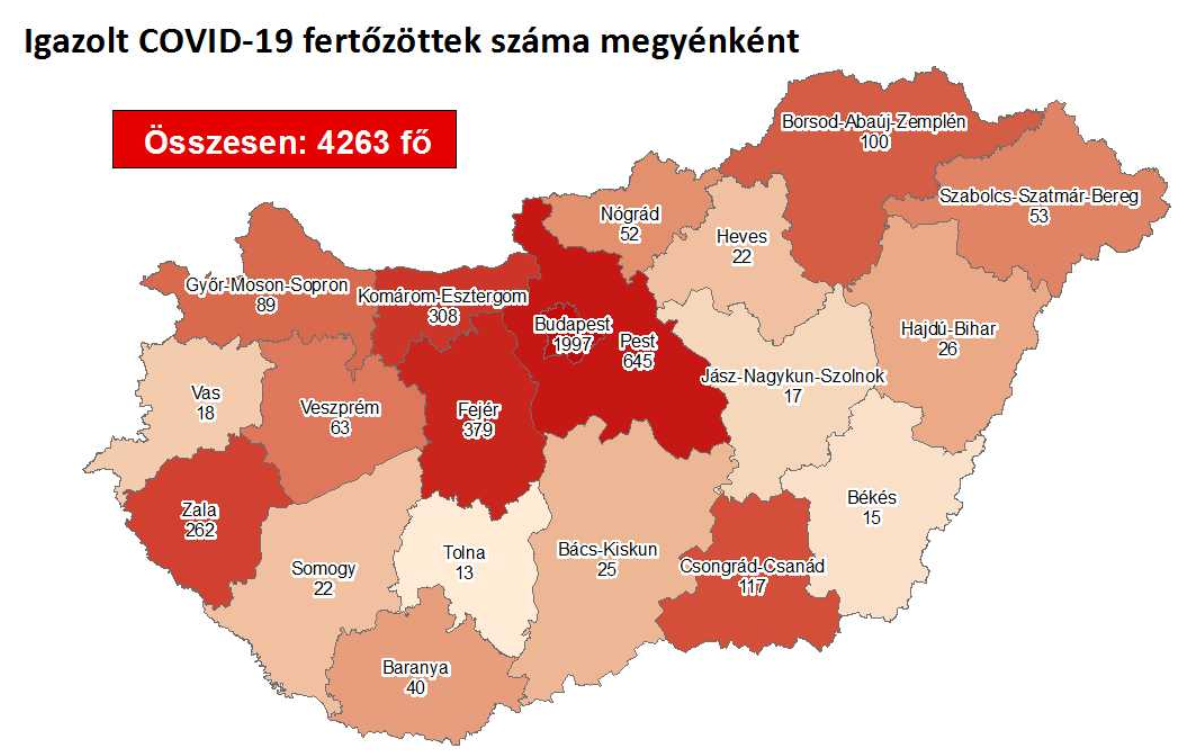 Az oldal térképe alapján eddig Budapesten (1997) és Pest megyében (645) regisztrálták a legtöbb fertőzöttet. Ezt követi Fejér (379), Komárom-Esztergom (308), Zala (262) és Csongrád-Csanád megye (117), a sor végén pedig Tolna megye áll (13).