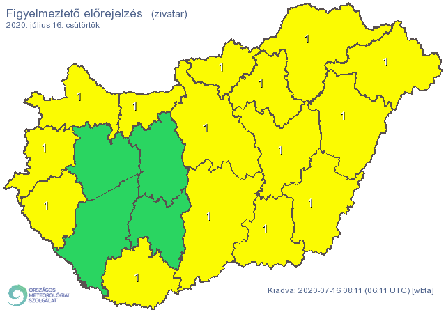 Veszélyjelzésükben azt írták: késő délelőttől legnagyobb eséllyel a Tisza körüli szélesebb sávban, később pedig attól keletre, valamint az Észak-Dunántúlon várható helyenként zivatarok kialakulása.