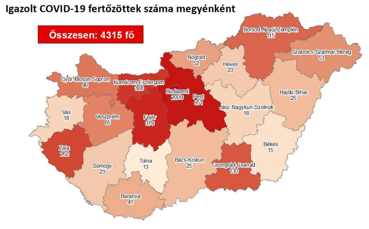 Az oldal térképe alapján eddig Budapesten (2009) és Pest megyében (651) regisztrálták a legtöbb fertőzöttet. Ezt követi Fejér (379), Komárom-Esztergom (308), Zala (262) és Csongrád-Csanád megye (130), a sor végén pedig Tolna megye áll (13).