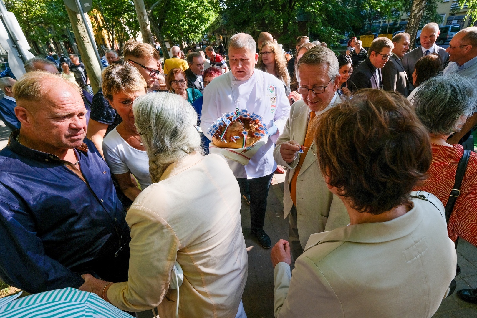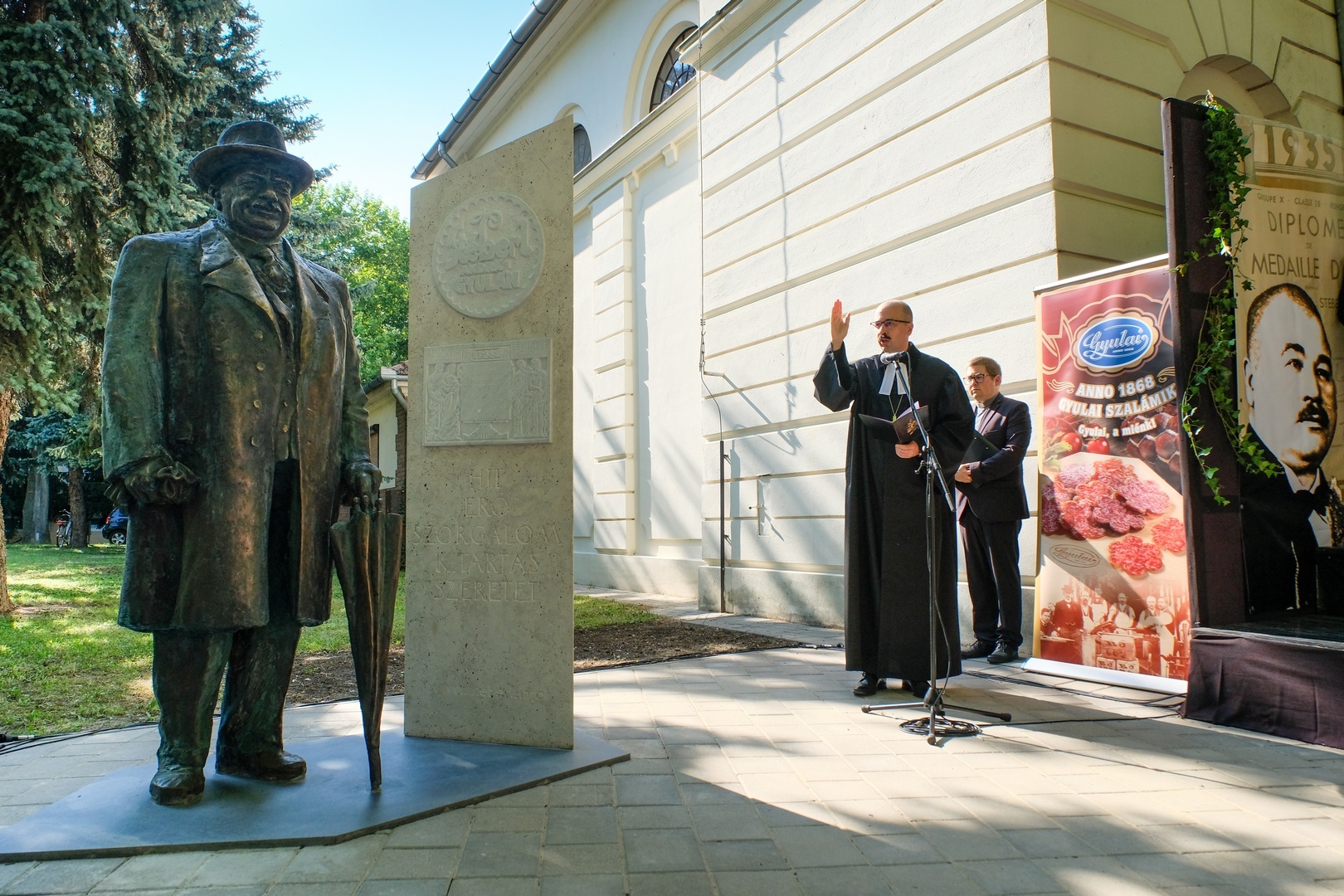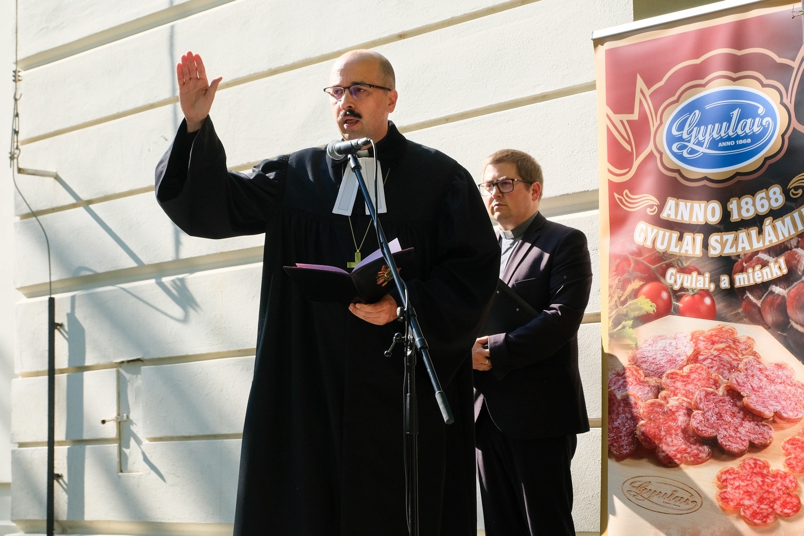 – Jelentős és fontos alkalomra gyűltünk ma össze – vette át a szót Kovács József országgyűlési képviselő. Mint fogalmazott, Stéberl András olyan alkotó polgára volt a városnak, aki méltón kap szobrot az evangélikus templom mellett, ezzel pedig még inkább bevésődik a helyiek tudatába a gyulai kolbász megalkotójának emléke.