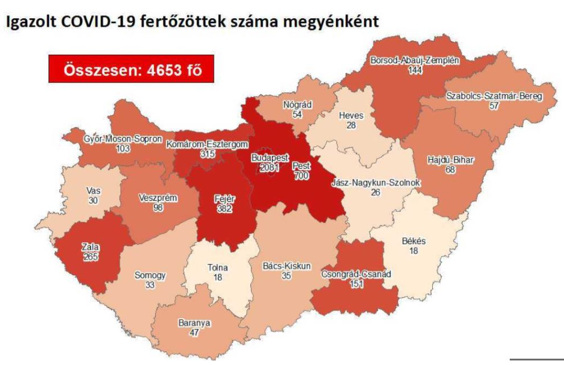 Az oldal térképe alapján eddig Budapesten (2081) és Pest megyében (700) regisztrálták a legtöbb fertőzöttet. Ezt követi Fejér (382), Komárom-Esztergom (315), Zala (265), Csongrád-Csanád megye (151), Borsod-Abaúj-Zemplén (144) és Győr-Moson-Sopron megye (103), a sor végén pedig Békés és Tolna megye áll (18-18).