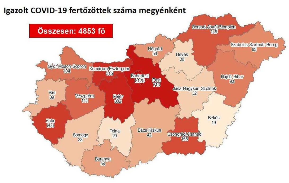 Az oldal térképe alapján eddig Budapesten (2125) és Pest megyében (713) regisztrálták a legtöbb fertőzöttet. Ezt követi Fejér (382), Komárom-Esztergom (315), Zala (266), Csongrád-Csanád (155), Borsod-Abaúj-Zemplén (149), Veszprém (141) és Győr-Moson-Sopron megye (104), a sor végén pedig Békés megye áll (19).