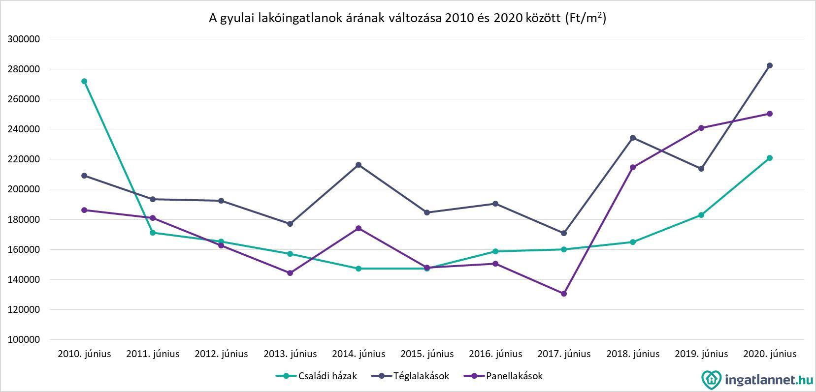 A portál azt is megjegyezte: bár a 2019-es év végén és a 2020-as évben országszerte stagnáltak, illetve csökkentek az ingatlanárak, Gyulán folytatódott az árnövekedés.