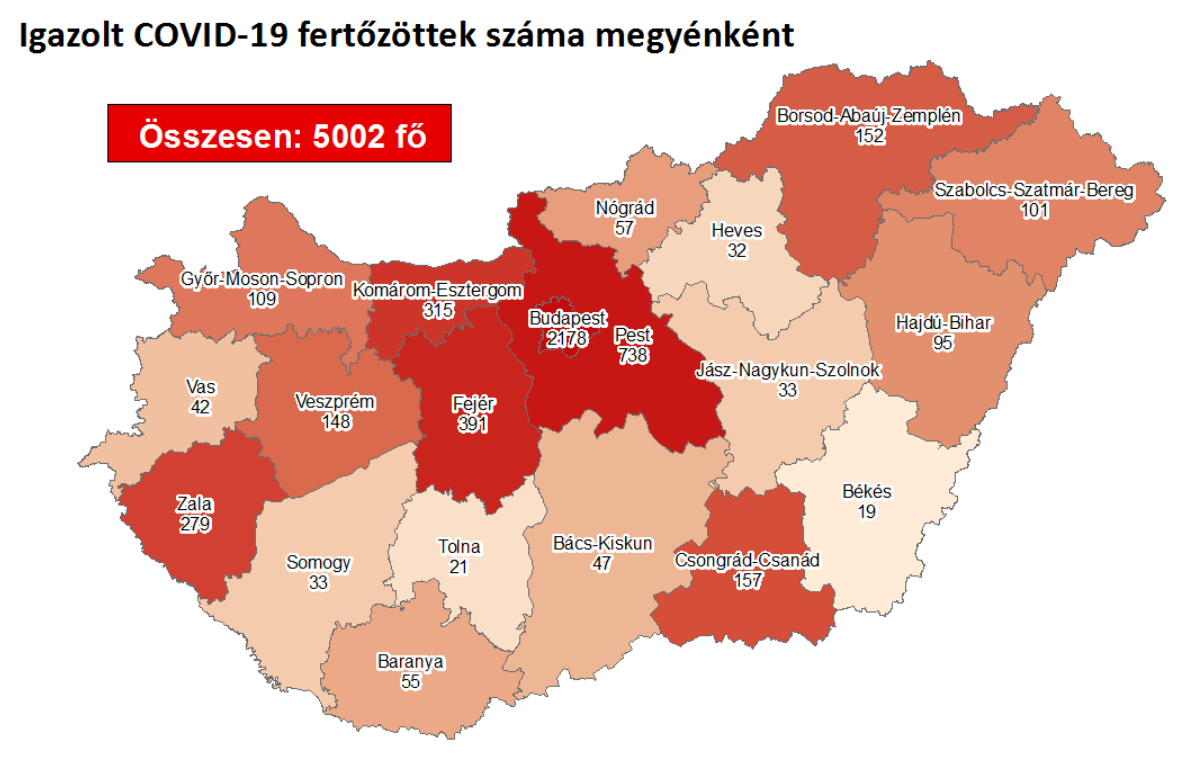 Az oldal térképe alapján eddig Budapesten (2178) és Pest megyében (738) regisztrálták a legtöbb fertőzöttet. Ezt követi Fejér (391), Komárom-Esztergom (315), Zala (279), Csongrád-Csanád (157), Borsod-Abaúj-Zemplén (152), Veszprém (148) és Győr-Moson-Sopron megye (109), a sor végén Békés megye áll (19).