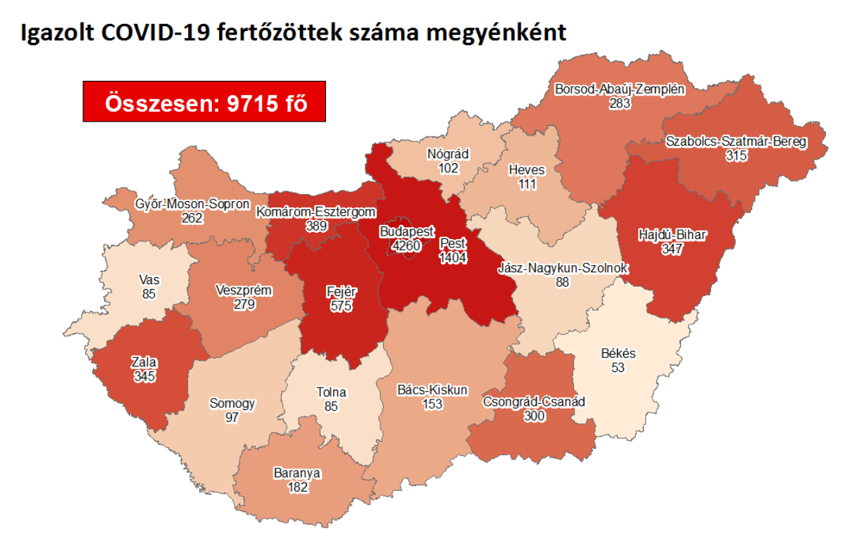 A kormányzati portálon azt írták: 9715-re nőtt a Magyarországon eddig azonosított fertőzöttek száma. Az elhunytak száma 628-ra emelkedett. 3984-en már meggyógyultak. Az aktív fertőzöttek száma 5103.