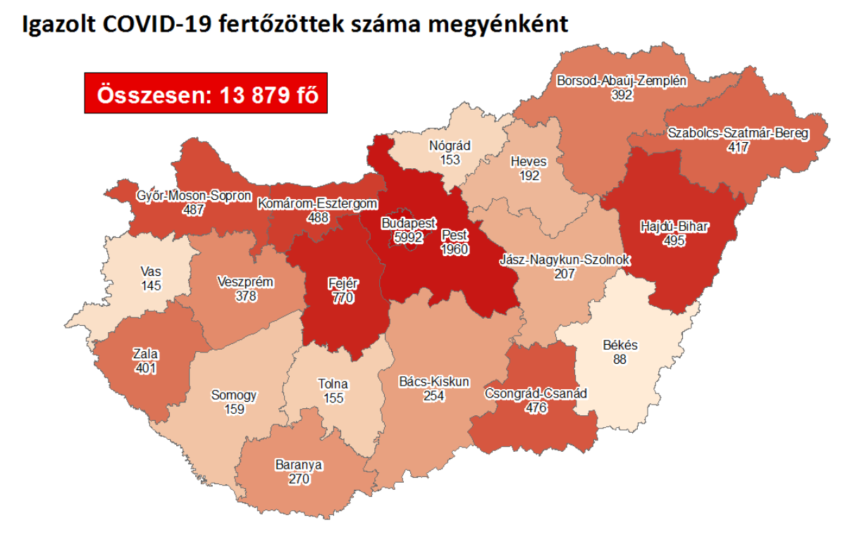 A kormányzati portálon azt írták: 13 879-re nőtt a Magyarországon azonosított fertőzöttek száma. Az elhunytak száma 646-ra emelkedett, 4130-an már meggyógyultak.