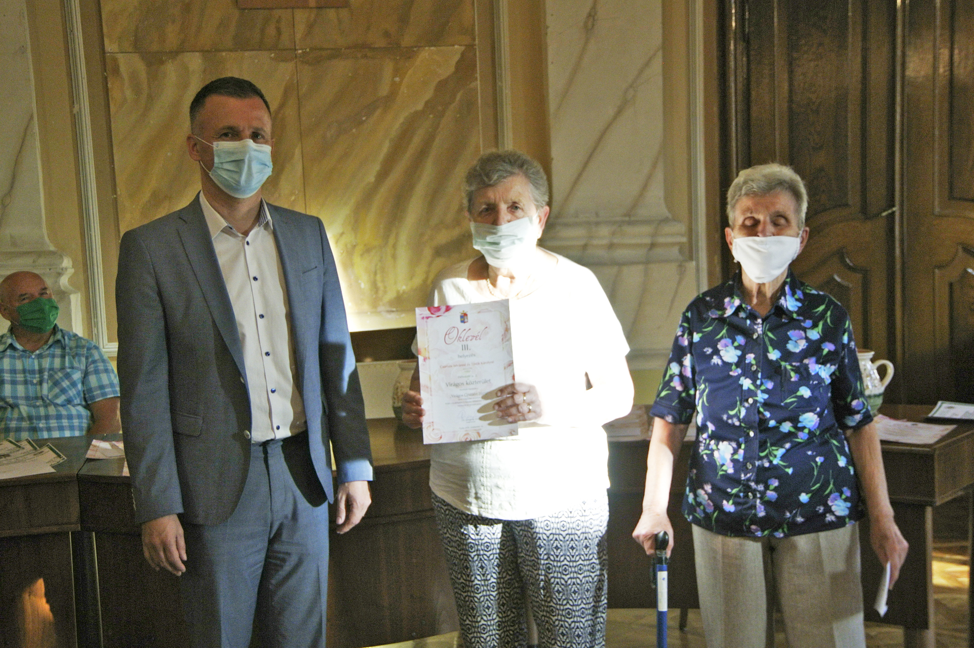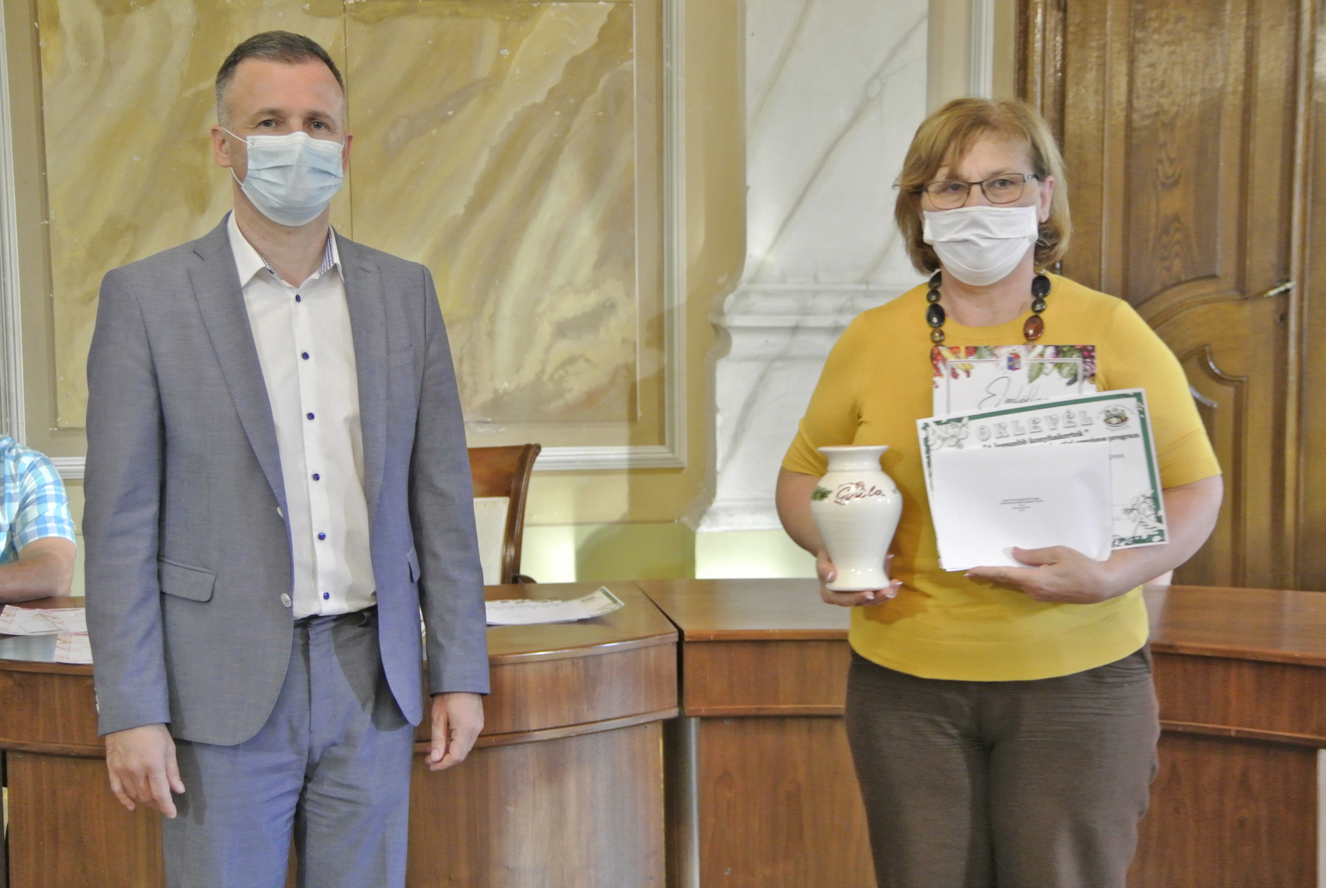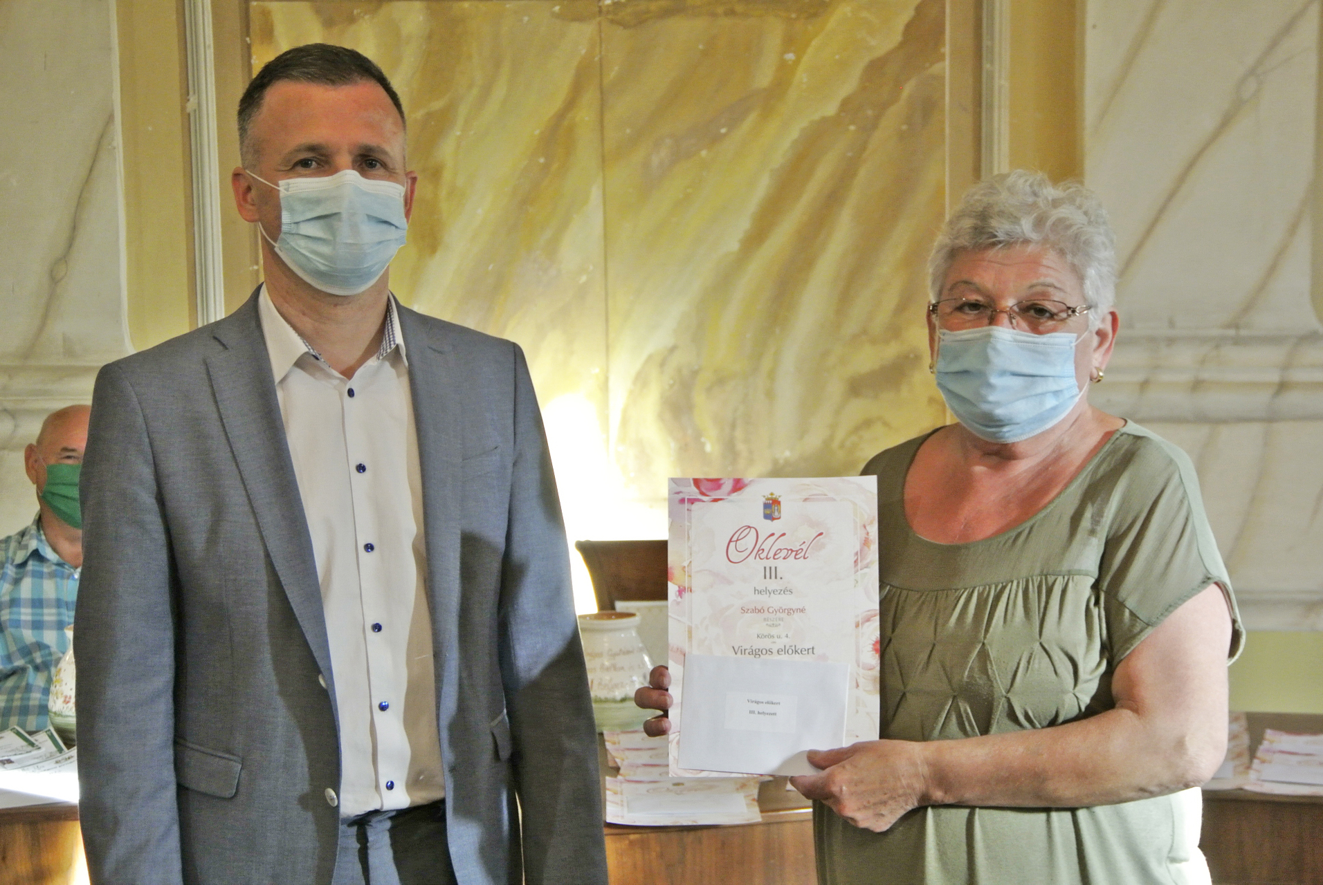 A köszöntő után következett a virágosítási verseny és a legszebb konyhakertek díjainak átadása, majd tolmácsolták Sári Kovács Szilvia, a legszebb konyhakertek verseny ötletgazdájának levelét, valamint oklevelet nyújtottak át a zsűrizéséért Pomázi Ferencnek és Werner Györgynek, valamint Hajnal Editnek a koordinálásért és szervező munkáért.