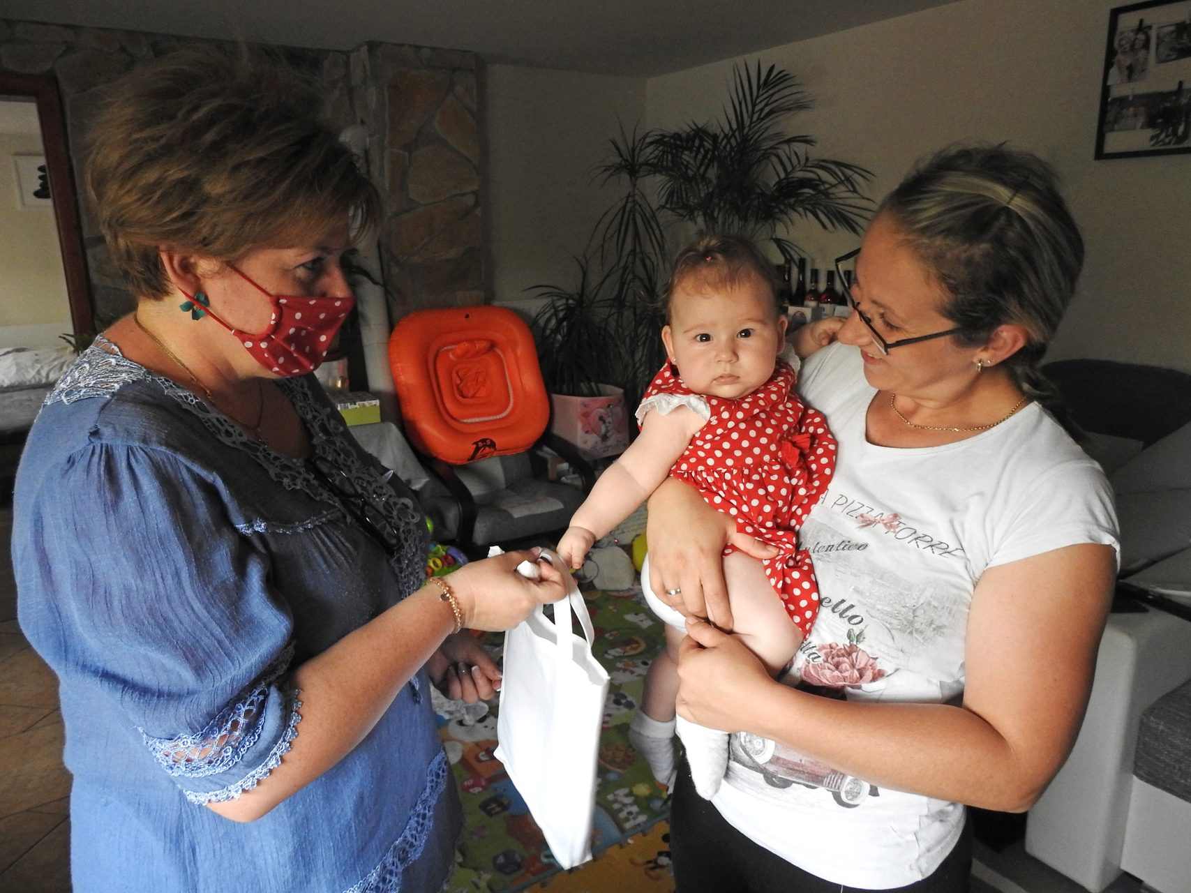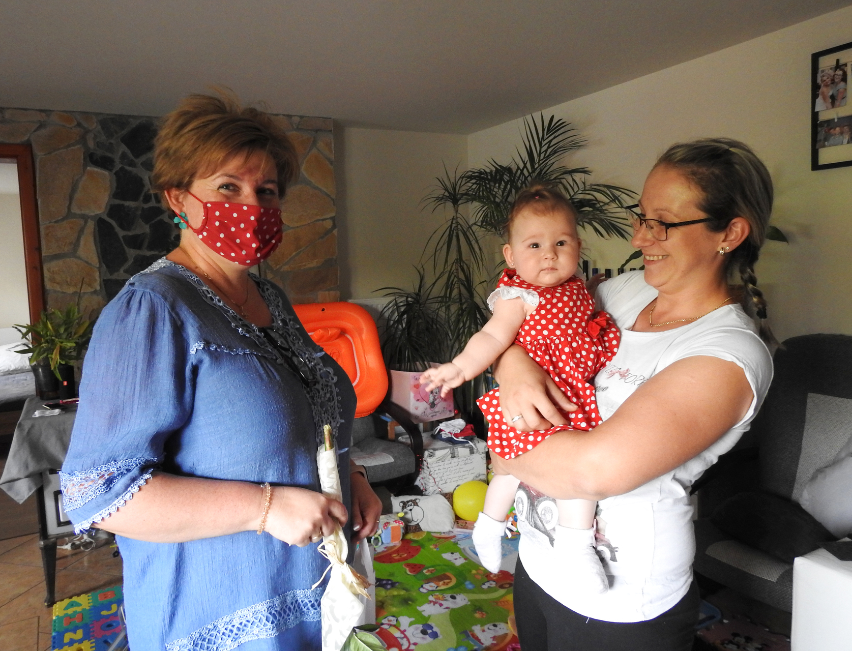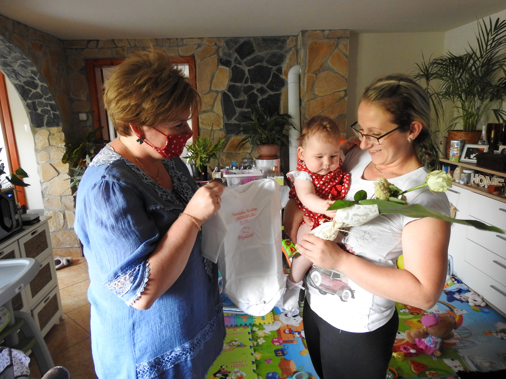 Grétát és anyukáját egyedileg hímzett babaruhával, Póka György festményével és virággal ajándékozta meg Kiss Tamásné.
