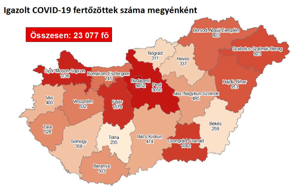 A kormányzati portálon azt írták: 23 077-re nőtt a Magyarországon azonosított fertőzöttek száma. Az elhunytak száma 730-ra emelkedett, 5099-en már meggyógyultak.