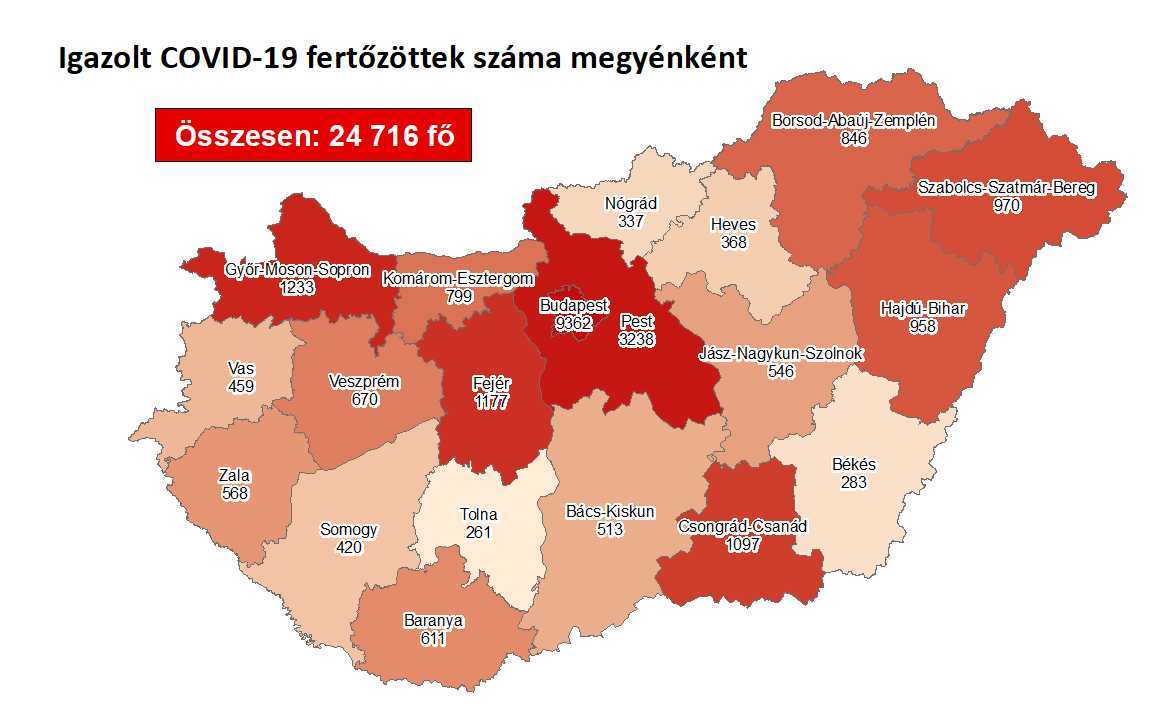A kormányzati portálon azt írták: 24 716-ra nőtt a Magyarországon azonosított fertőzöttek száma. Az elhunytak száma 749-ra emelkedett, 5152-en már meggyógyultak. Az aktív fertőzöttek száma 18 815. Az aktív fertőzöttek 37 százaléka, az elhunytak 54 százaléka, a gyógyultak 39 százaléka budapesti. 693 koronavírusos beteget ápolnak kórházban, közülük 44-en vannak lélegeztetőgépen. Hatósági házi karanténban 24 017-en vannak, a mintavételek száma 697 473-ra nőtt.