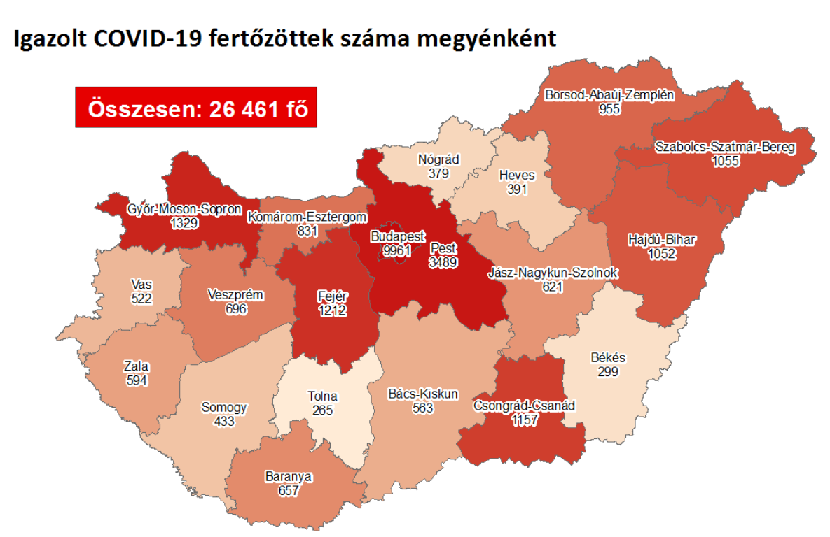 A kormányzati portálon azt írták: 26 461-re nőtt a Magyarországon azonosított fertőzöttek száma. Az elhunytak száma 765-re emelkedett, 5890-en már meggyógyultak.