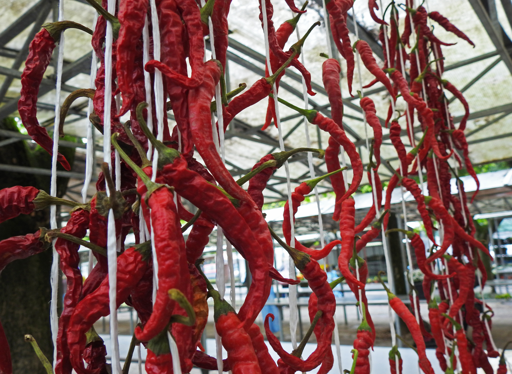 Darabonként és füzérben is kapható szárított csilipaprika a gyulai piacon.