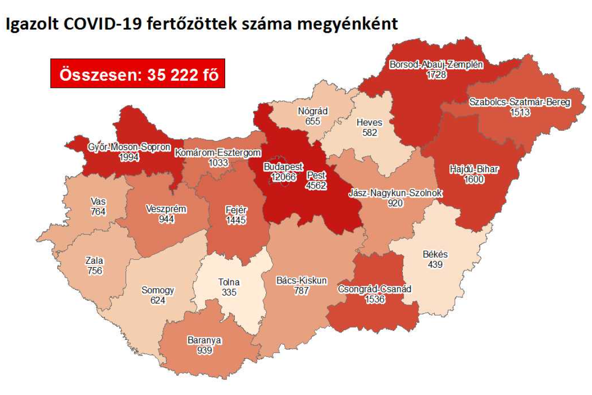 A kormányzati portálon azt írták: 35 222-re nőtt a Magyarországon azonosított fertőzöttek száma. Az elhunytak száma 913-ra emelkedett, 9202-en már meggyógyultak.