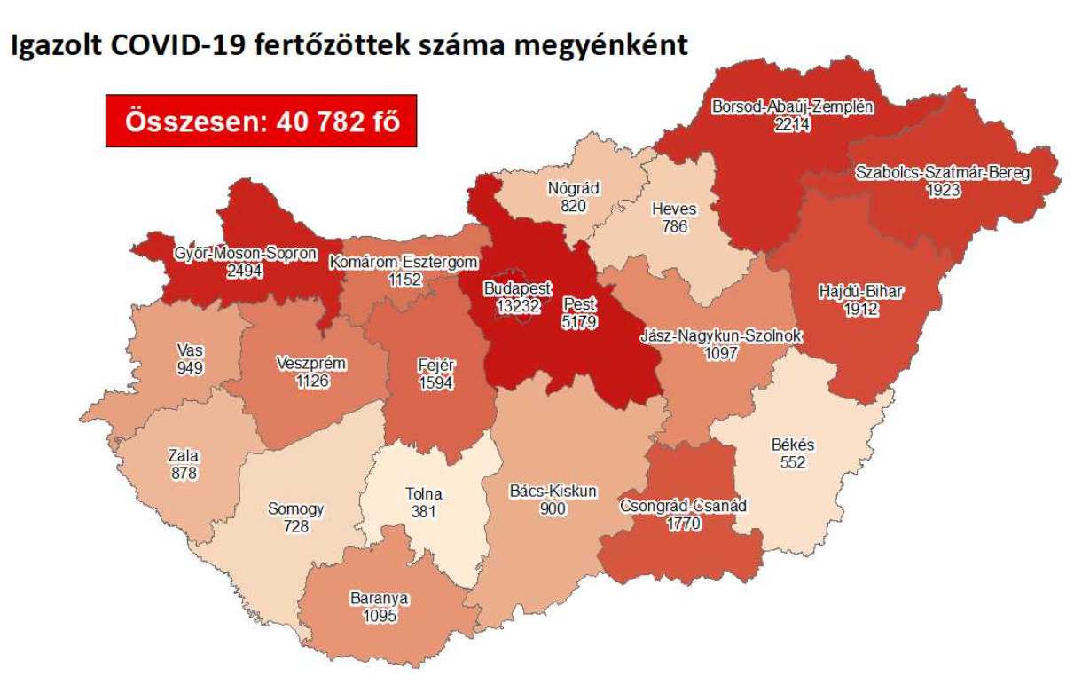 A kormányzati portálon azt írták: 40 782-re nőtt a Magyarországon azonosított fertőzöttek száma. Az elhunytak száma 1023-ra emelkedett, 12 164-en már meggyógyultak.