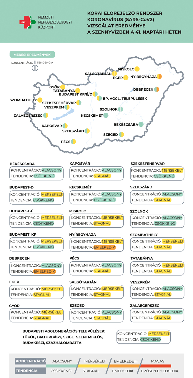 Békéscsabán, Székesfehérváron, Kecskeméten, Szolnokon, Budapesten és az agglomerációban csökkenő, míg Debrecenben és Nyíregyházán növekvő tendenciát mutattak ki az új koronavírus örökítőanyagának mennyiségében a 41. héten végzett szennyvízvizsgálatok – közölte szerdán a Nemzeti Népegészségügyi Központ.
