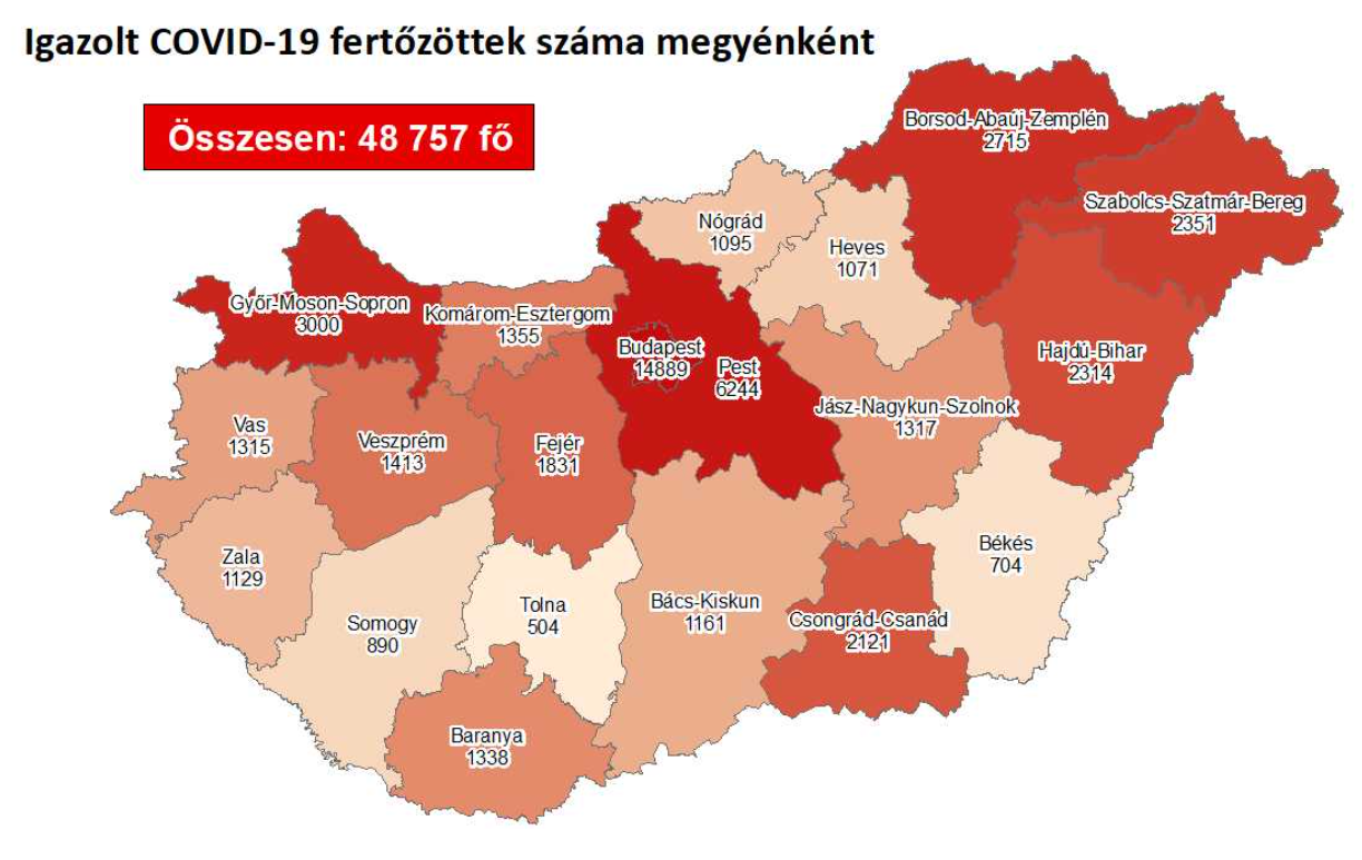 A kormányzati portálon azt írták: 48 757-re nőtt a Magyarországon azonosított fertőzöttek száma. Az elhunytak száma 1211-re emelkedett, 14 637-en már meggyógyultak.