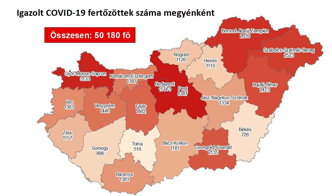 A kormányzati portálon azt írták: 50 180-ra nőtt a Magyarországon azonosított fertőzöttek száma. Az elhunytak száma 1259-re emelkedett, 14 905-en már meggyógyultak. Az aktív fertőzöttek száma 34 016. Az aktív fertőzöttek 30 százaléka, az elhunytak 39 százaléka, a gyógyultak 30 százaléka budapesti. 2023 koronavírusos beteget ápolnak kórházban, közülük 201-en vannak lélegeztetőgépen. Hatósági házi karanténban 25 203-an vannak, a mintavételek száma 919 481.
