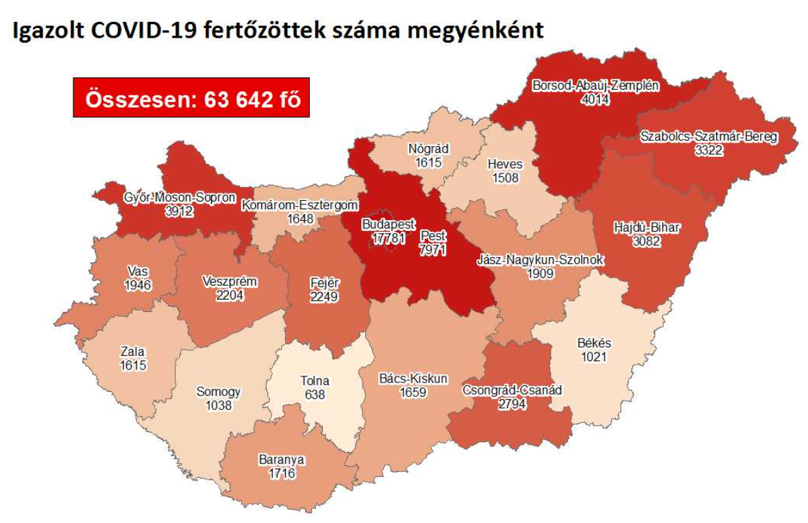 A kormányzati portálon azt írták: 63 642-re nőtt a Magyarországon azonosított fertőzöttek száma. Az elhunytak száma 1535-re emelkedett, 16 446-an már meggyógyultak.
