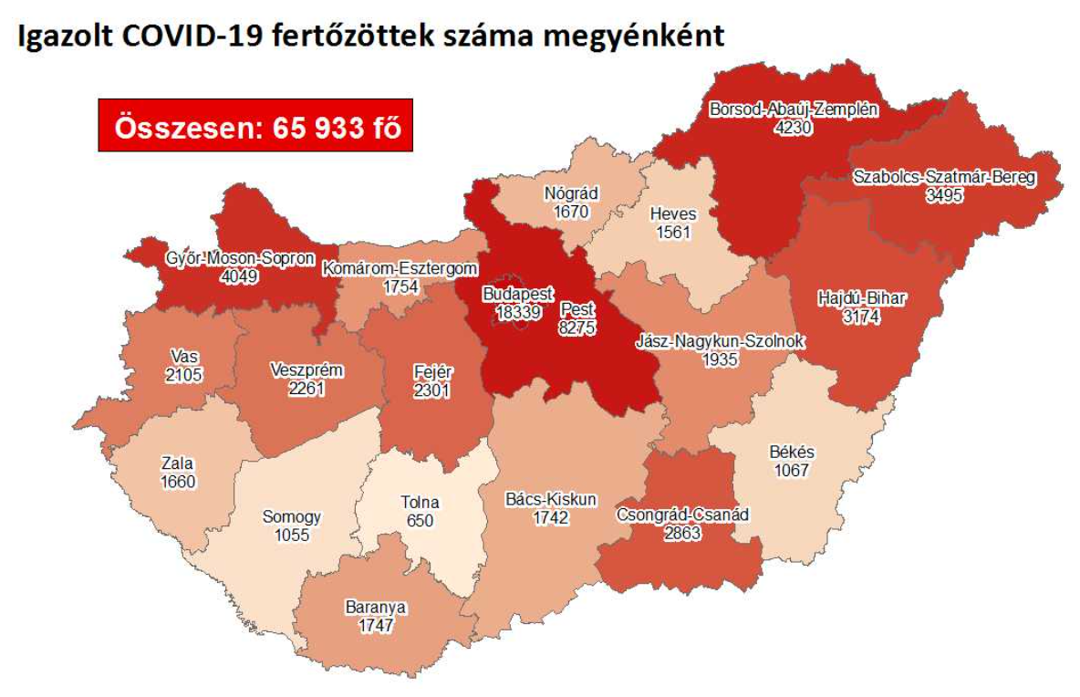 A kormányzati portálon azt írták: 65 933-ra nőtt a Magyarországon azonosított fertőzöttek száma. Az elhunytak száma 1578-ra emelkedett, 17 098-an már meggyógyultak.