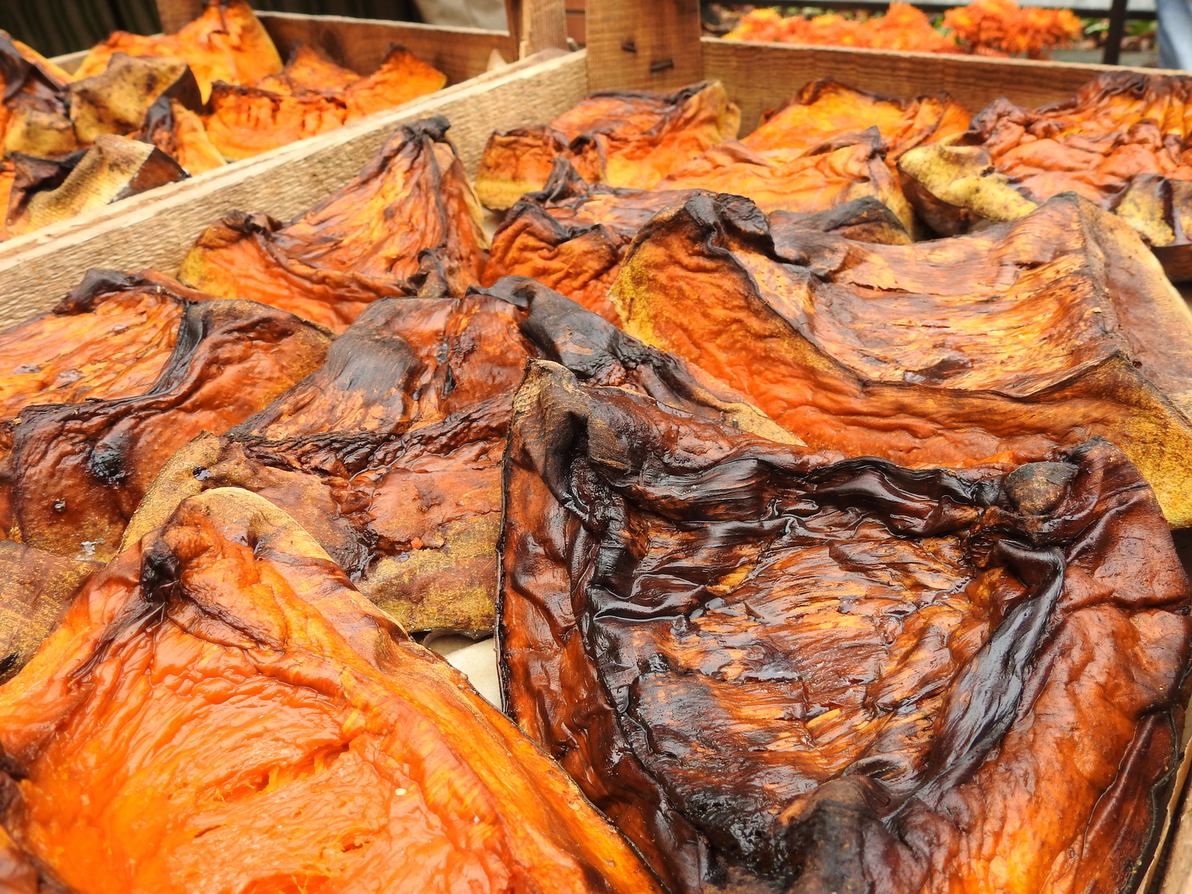 A standon szürke héjú, narancssárga húsú tök kapható. Az árus elmondta: a régi tájfajtát maga termeli, és fatüzelésű kemencében süti meg.