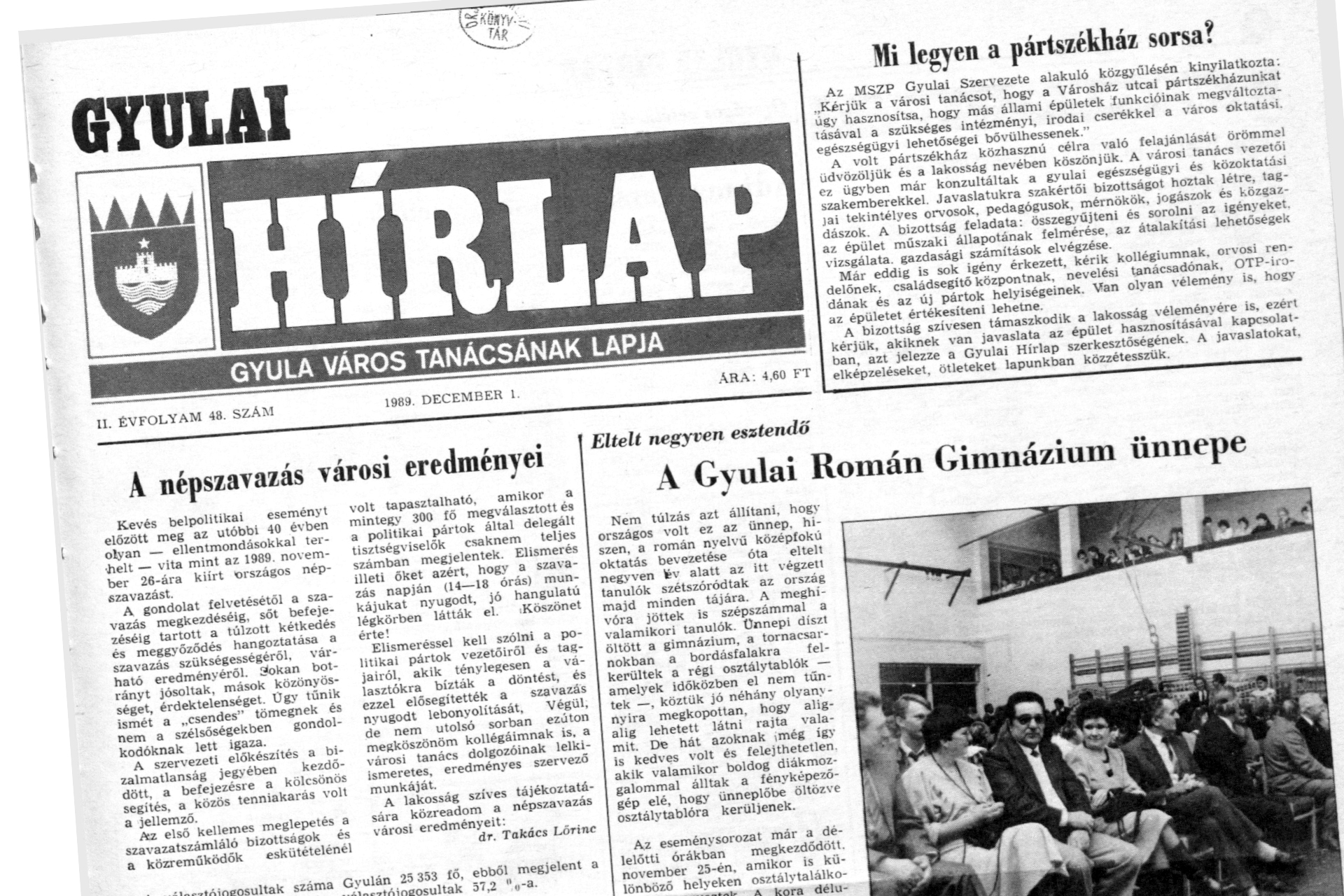Mi legyen a pártszékház sorsa? – tette fel a sokakat érdeklő kérdést első oldalán a Gyulai Hírlap. „A volt pártszékház közhasznú célra való felajánlását örömmel üdvözöljük, és a lakosság nevében köszönjük. A városi tanács vezetői ez ügyben már konzultáltak a gyulai egészségügyi és közoktatási szakemberekkel. Javaslatukra szakértői bizottságot hoztak létre, tagjai tekintélyes orvosok, pedagógusok, mérnökök, jogászok és közgazdászok. A bizottság feladata: összegyűjteni és sorolni az igényeket, az épület műszaki állapotának felmérése, az átalakítási lehetőségek vizsgálata, gazdasági számítások elvégzése (…) A bizottság szívesen támaszkodik a lakosság véleményére is, ezért, kérjük, akinek van javaslata az épület hasznosításával kapcsolatban, azt jelezze a Gyulai Hírlap szerkesztőségének.”