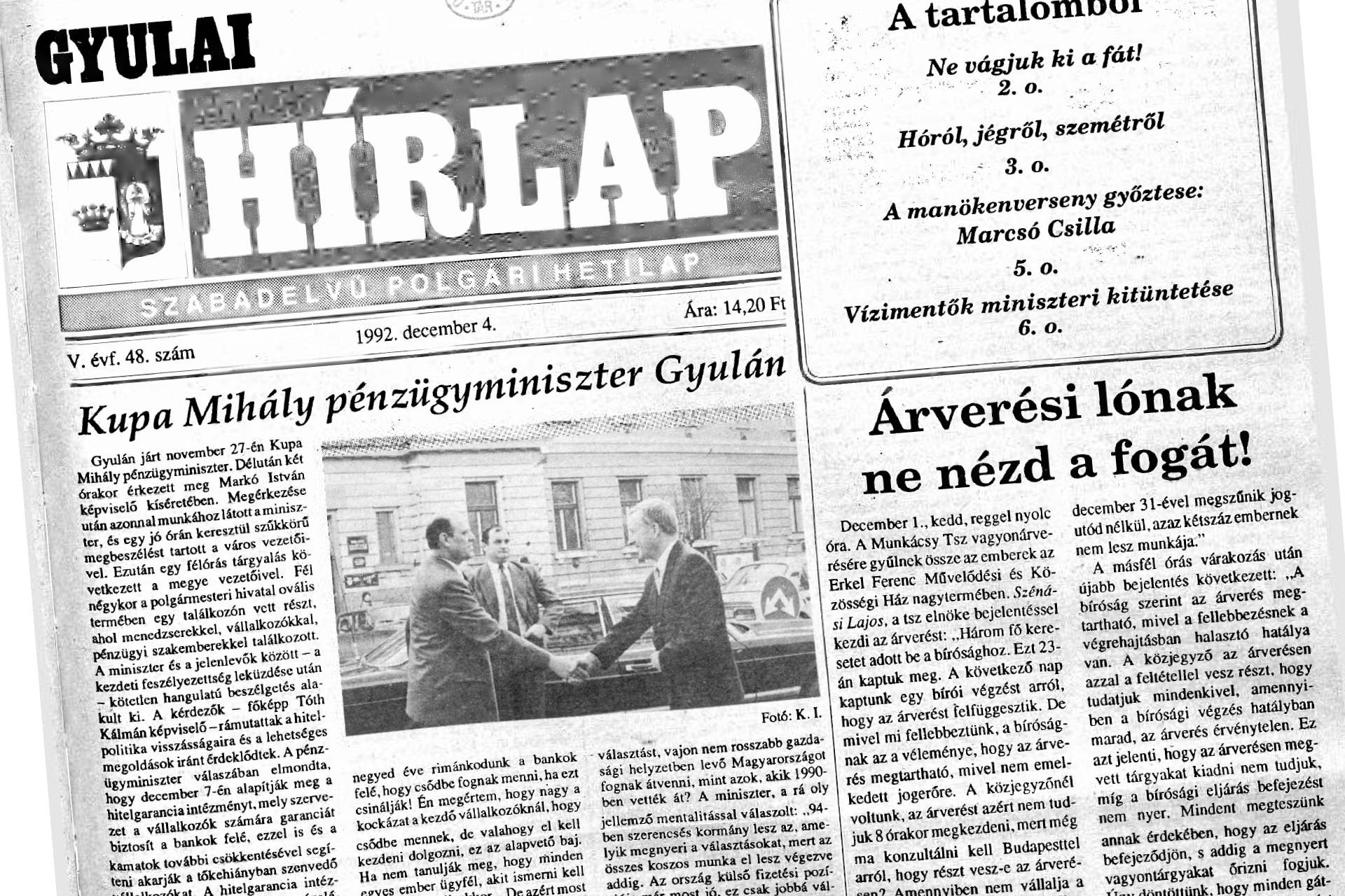 A Gyulai Hírlap első oldalán Keres István fotója: Kupa Mihályt fogadja a városháza előtt dr. Pocsay Gábor polgármester. „Gyulán járt november 27-en Kupa Mihály pénzügyminiszter. Délután két órakor érkezett meg Markó István képviselő kíséretében. Megérkezése után azonnal munkához látott a miniszter, és egy jó órán keresztül szűkkörű megbeszélést tartott a város vezetőivel. Ezután egy félórás tárgyalás következett a megye vezetőivel. Fél négykor a polgármesteri hivatal ovális termében egy találkozón vett részt, ahol menedzserekkel, vállalkozókkal, pénzügyi szakemberekkel találkozott.”
