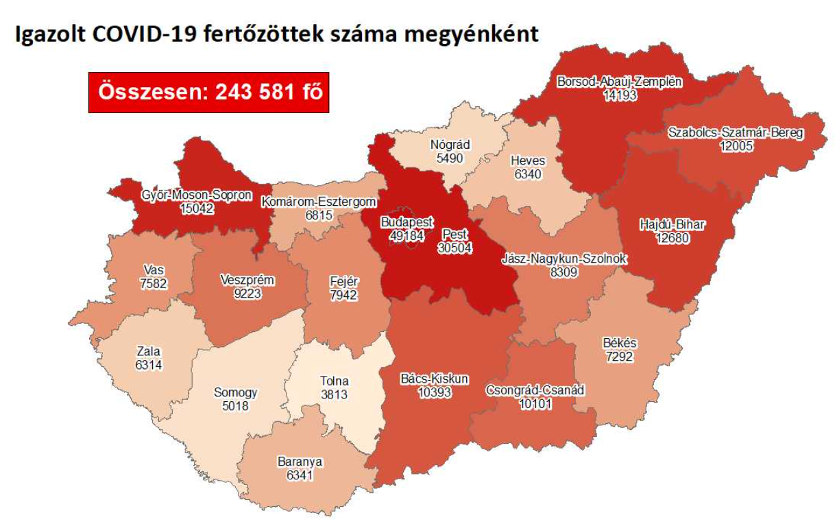 A kormányzati portálon azt írták: 243 581-re nőtt a Magyarországon azonosított fertőzöttek száma. Az elhunytaké 5706-ra emelkedett, a gyógyultak száma 70 396.