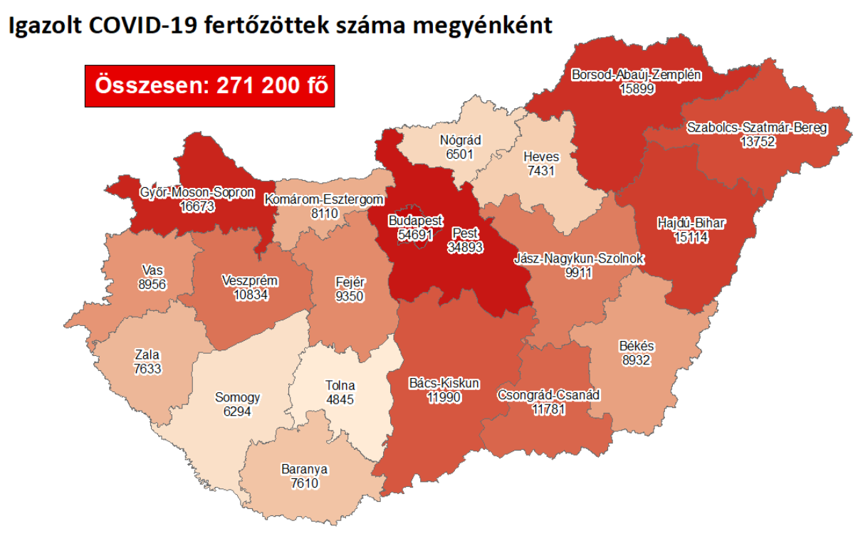 A kormányzati portálon azt írták: 271 200-ra nőtt a Magyarországon azonosított fertőzöttek száma. Az elhunytaké 6622-re emelkedett, a gyógyultak száma 78 700.