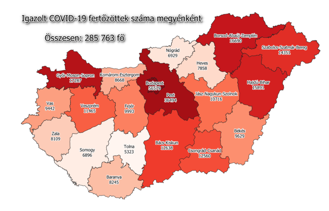 A kormányzati portálon azt írták: 285 763-ra nőtt a Magyarországon azonosított fertőzöttek száma. Az elhunytaké 7237-re emelkedett, a gyógyultak száma 83 115.