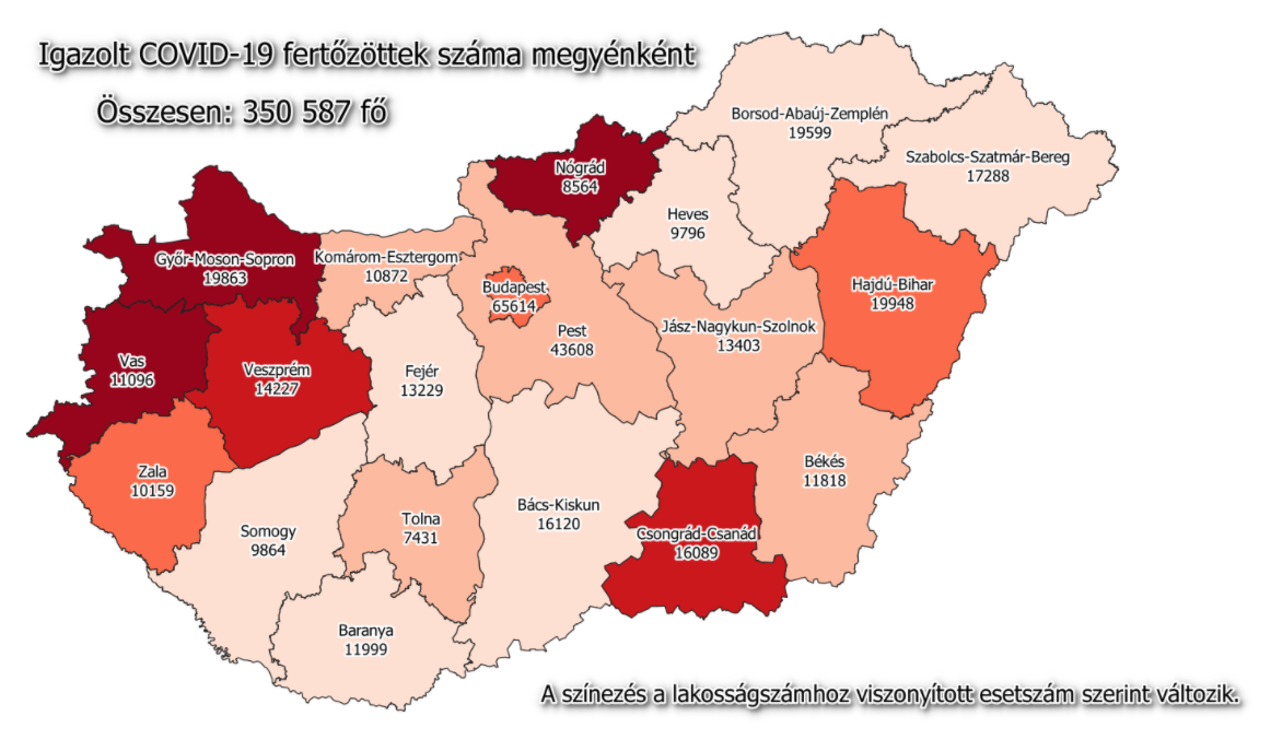 A kormányzati portálon azt írták: 350 587-re nőtt a Magyarországon azonosított fertőzöttek száma. Az elhunytaké 11 264-re emelkedett.