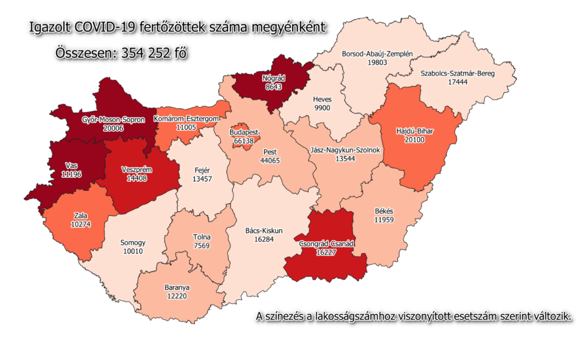 A kormányzati portálon azt írták: 354 252-re nőtt a Magyarországon azonosított fertőzöttek száma. Az elhunytaké 11 615-re emelkedett, a gyógyultak száma 233 232.