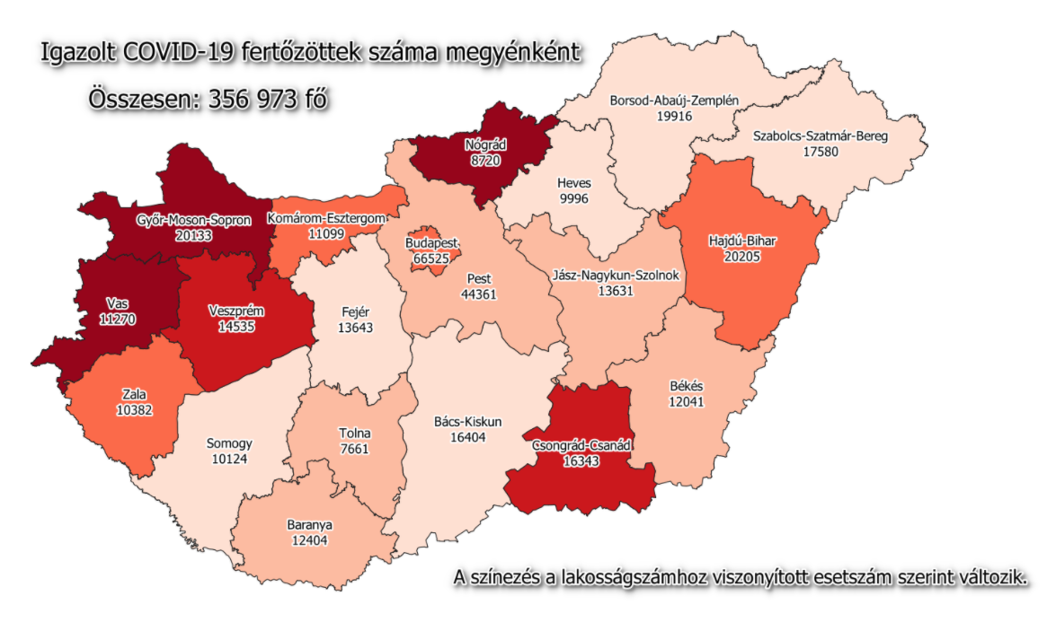 A kormányzati portálon azt írták: 356 973-ra nőtt a Magyarországon azonosított fertőzöttek száma. Az elhunytaké 11 811-re emelkedett, a gyógyultak száma 237 362.