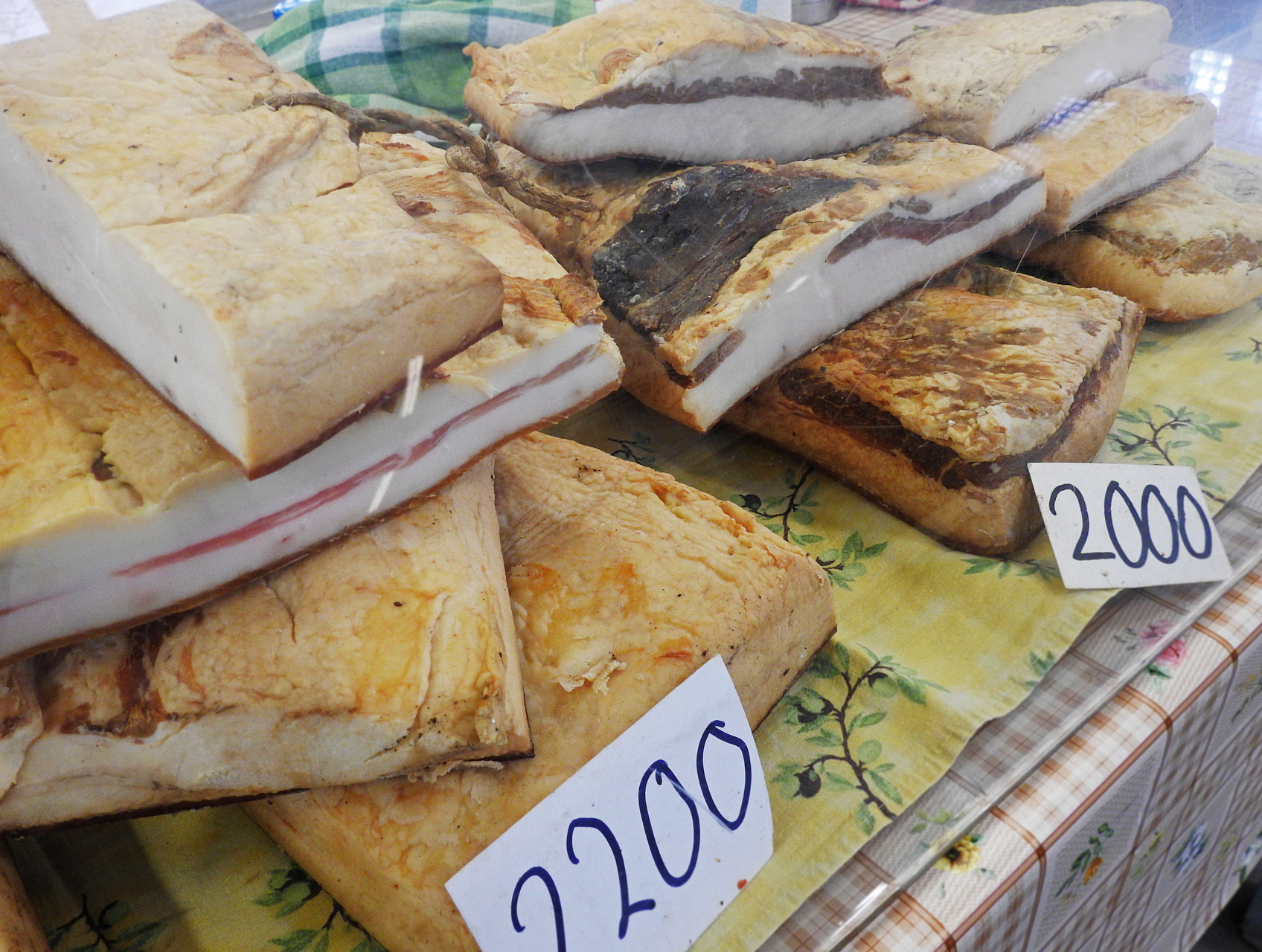 A hentesáru a csarnokban több standon is kapható. A húsos szalonna kilóját ottjártunkkor 2000–2800 forintért, a zsírszalonnáét 1800–2200 forintért, az abált szalonnáét 1500 forintért árulták. A mangalicaszalonna kilója 2200 forintba került.